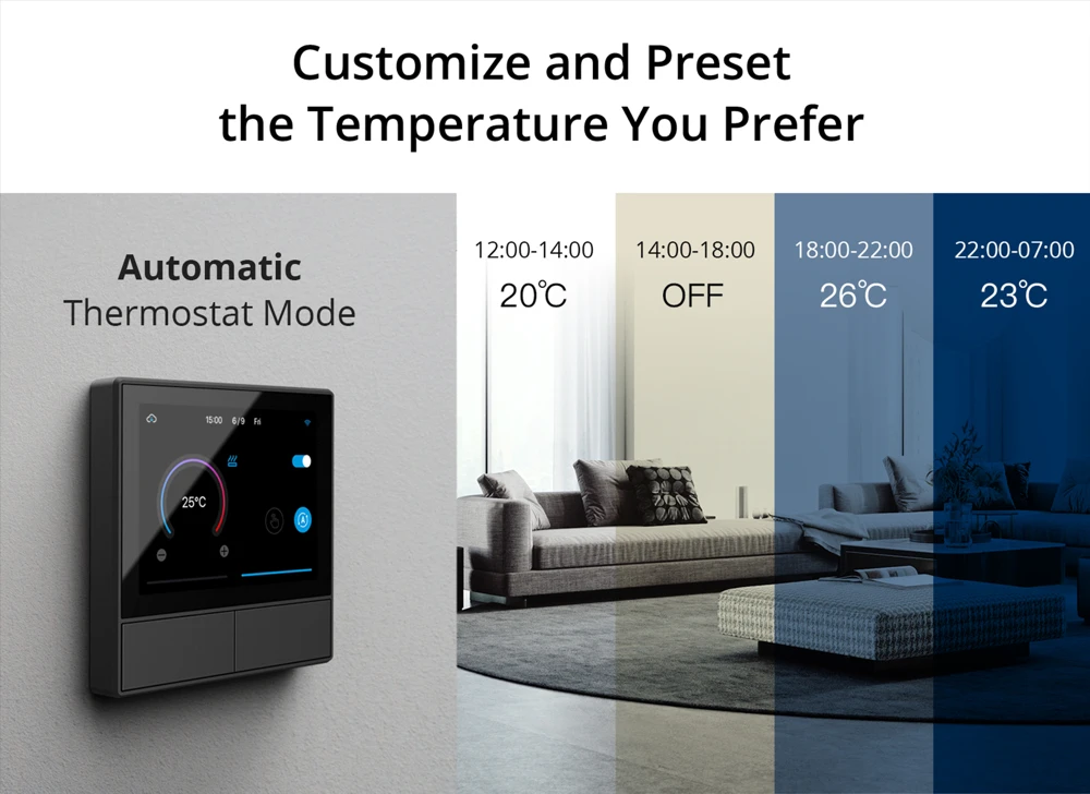 Ручной режим термостата позволяет регулировать температуру в любое время, что подходит вам и держать его равномерным и стабильным, в то время как его автоматический режим термостата предоставляет вам другие варианты. Вы можете устанавливать различные температуры в помещении в разное время суток, И NSPanel автоматически запускает нагревательные или охлаждающие устройства, чтобы сохранить температуру в помещении вашего дома в определенной точке в соответствии с вашим расписанием и настройками.