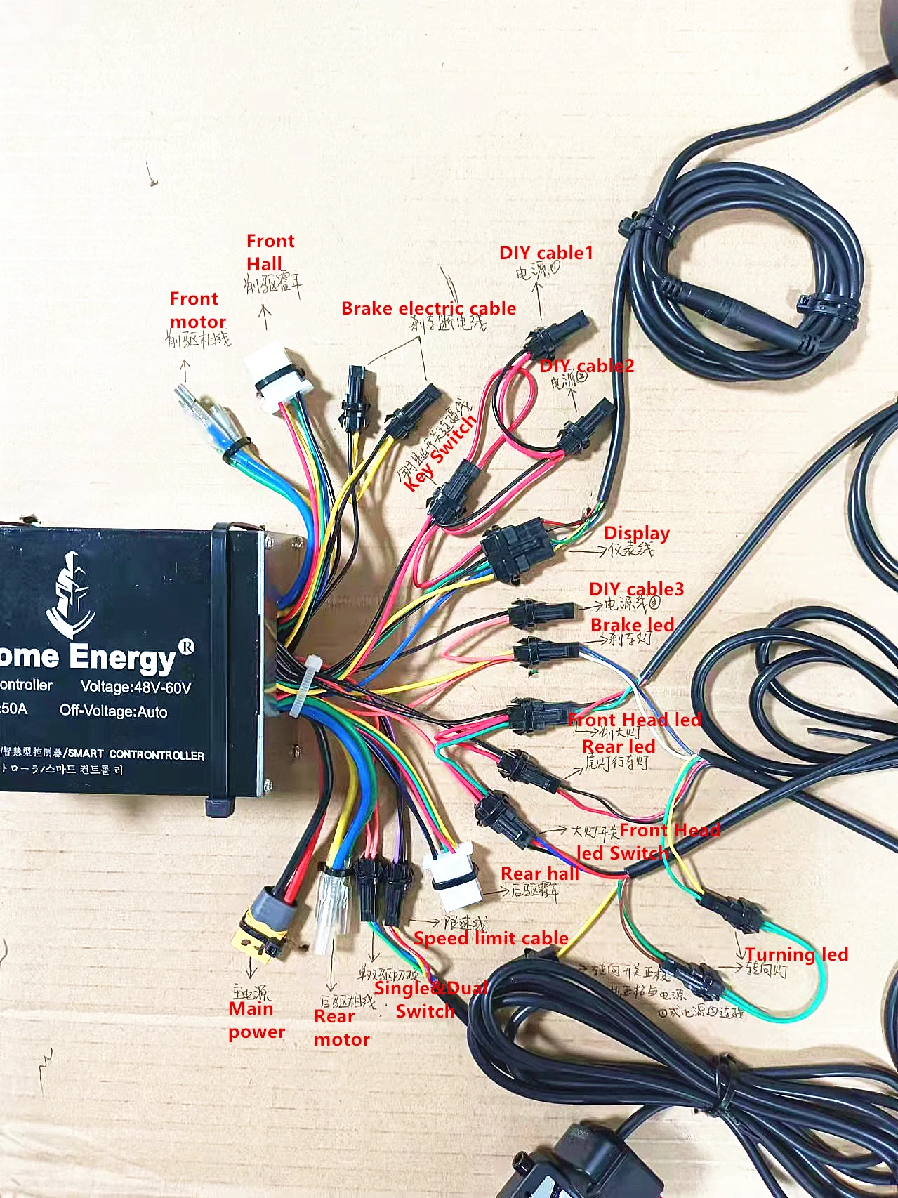 Новый умный контроллер Home Energy-это контроллер с отличной совместимостью, стабильностью, безопасностью и производительностью. Он может контролировать требования к производительности двух мощных двигателей с одним контроллером. Совместим с моторами с Холлом, а также моторами без холла, с рядом защитных механизмов для защиты безопасности системы управления. Он имеет несколько наборов силовых кабелей DIY для удовлетворения потребностей внешних устройств (напряжение скутера), И оснащен необходимыми жгутами проводов, такими как фары/одиночный и двойной привод/Сигналы поворота/кабель ограничения скорости, будет хорошим выбором для изменения системы управления.