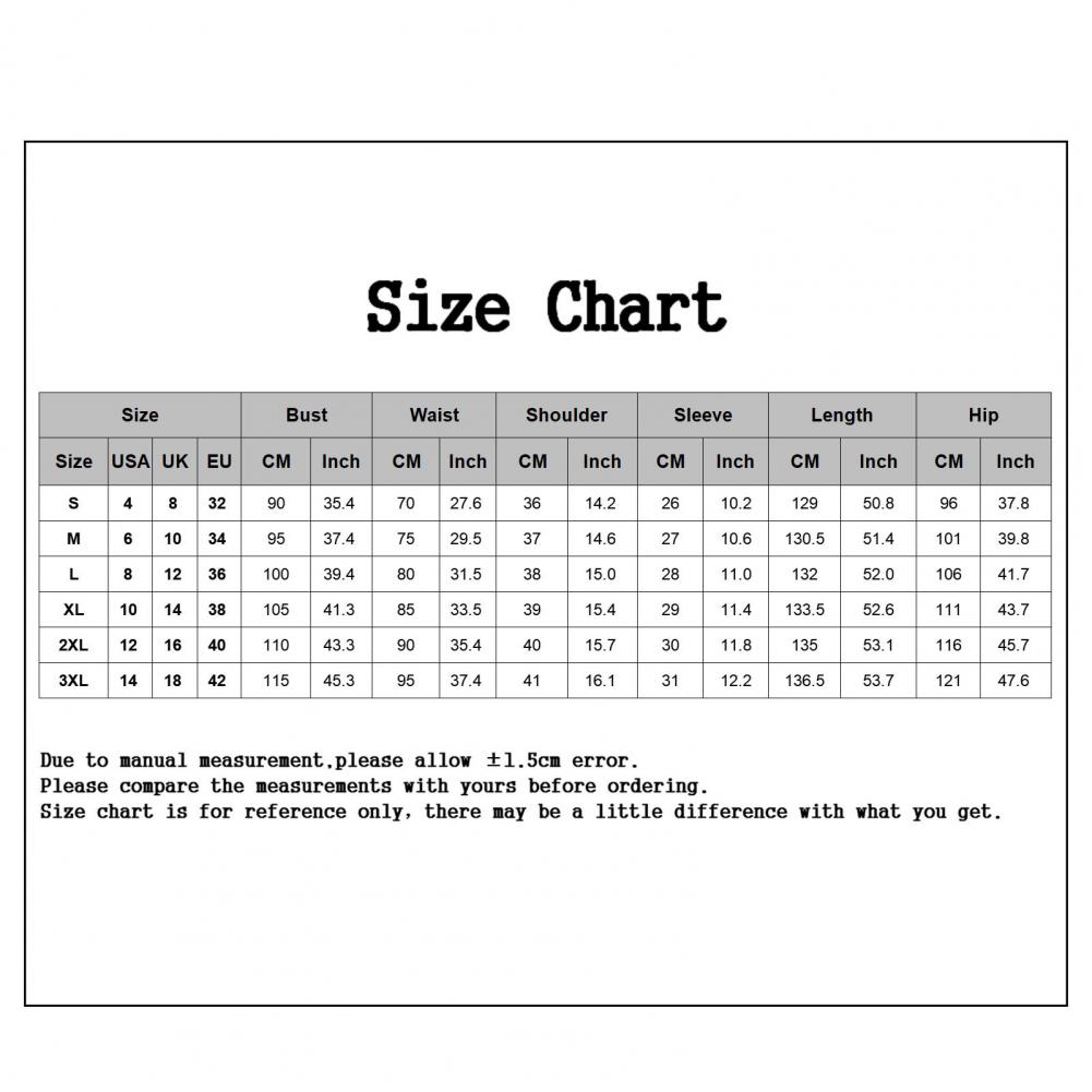 Размеры: 3XL, плечо: 41 см/16,1 ", рукав: 31 см/12,2", Длина: 136,5 см/53,7 ", Бюст: 115 см/45,3", обхват талии: 95 см/37,4 дюйма, обхват бедер: 121 см/47,6 дюйма (прибл.)