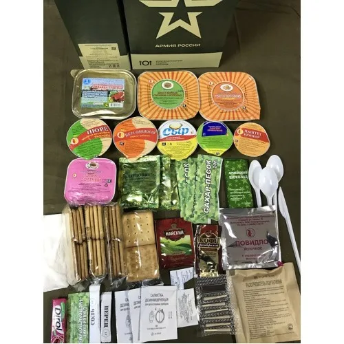 Сухой паек суточный ИРП (армейский сухпай) боевой, увеличенный, нового образца Армейские Будни, МО РФ.Сухпай идеальный набор для рыболовов, охотников, туристов,имеются разные варианты комплектации от 1,2,3,4,5,6,7 уточняйте ,срок годности тоже.Коробка изнутри покрыта фольгой и кратковременное нахождение под дождем ничем содержимому не повредит. Ручка для переноса это очень удобно в походных условиях. Но опускать сухпаёк в воду не стоит: шов на дне может пропустить влагу. Содержимое сухпайка размещено в картонной коробке, которая и защищает продукты от внешнего воздействия.