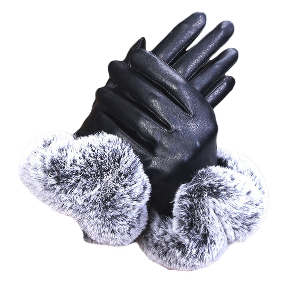 Женские черные кожаные перчатки осень зима теплые варежки из кроличьего меха