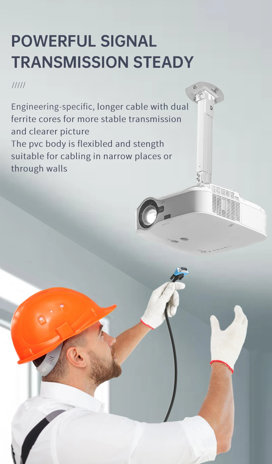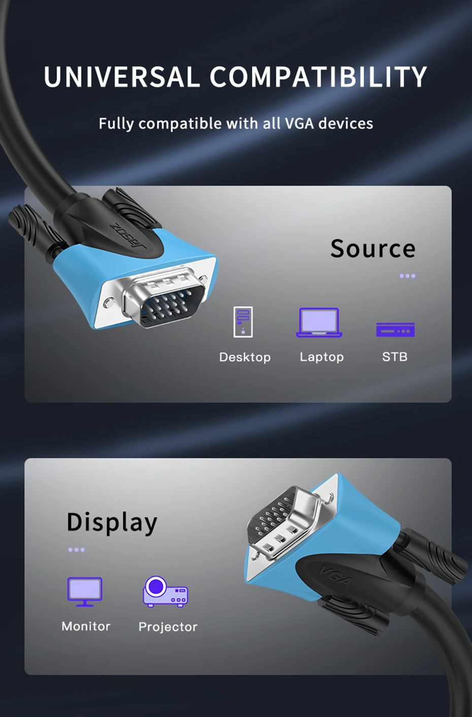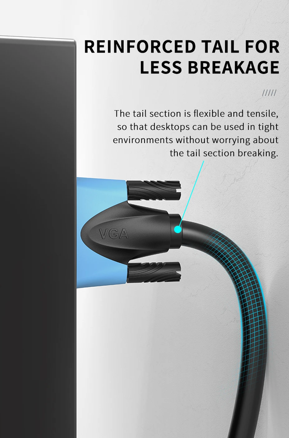 Шнур VGA спроектирован с формованными разъемами для сброса напряжения для долговечности, захваты протекторов для легкого подключения и отключения, а также затягивающиеся на палец винты для надежного соединения