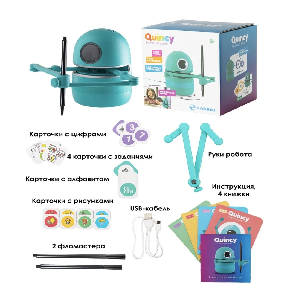 Главная миссия очаровательного пришельца — научить ребёнка рисовать! Такого милого и терпеливого преподавателя вы ещё не видели! Результаты обучения не заставят себя ждать, ведь рисовать вместе с Quincy не только легко, но и невероятно интересно. Просто невозможно остановиться! C роботом-художником Quincy, образовательный процесс превратится в увлекательную игру!