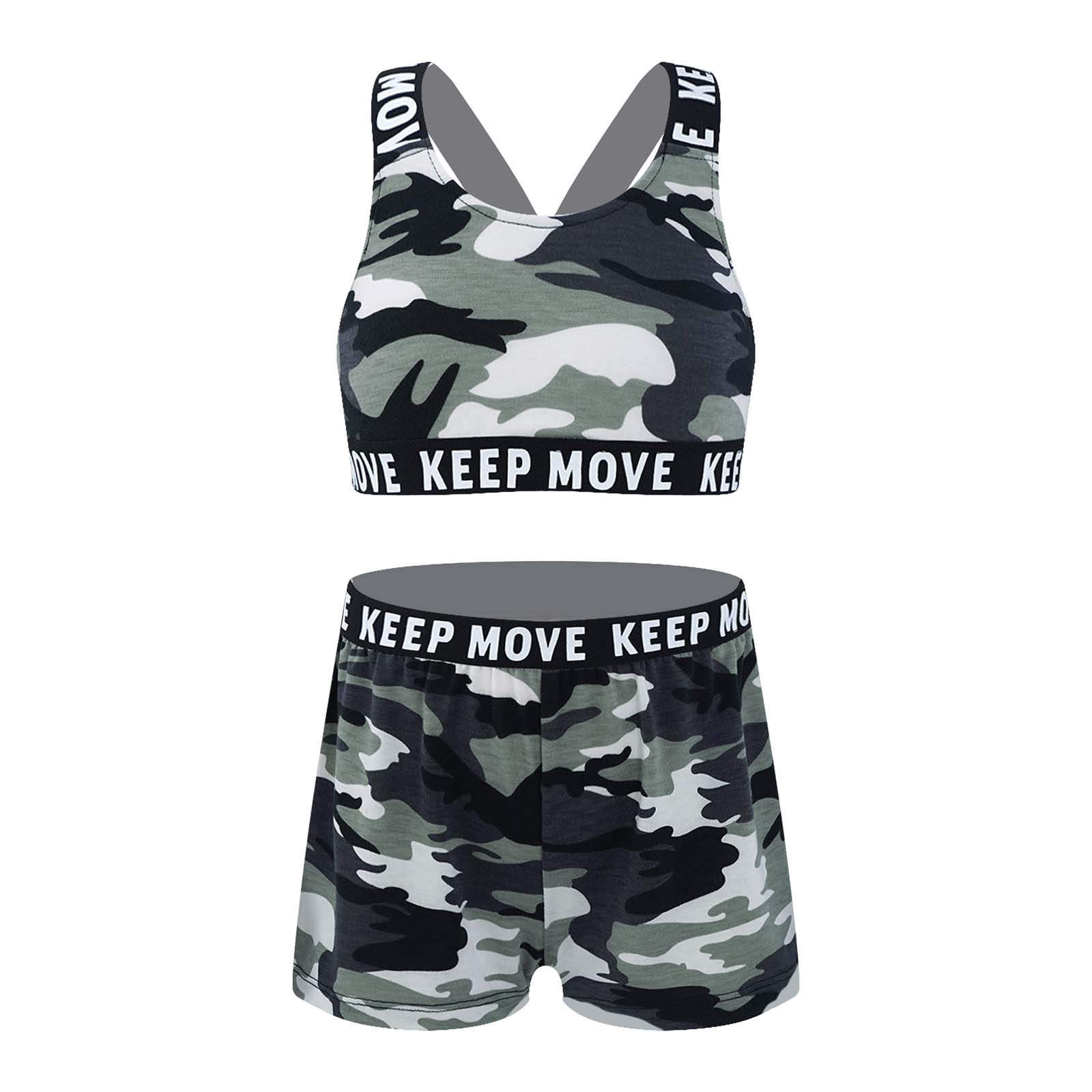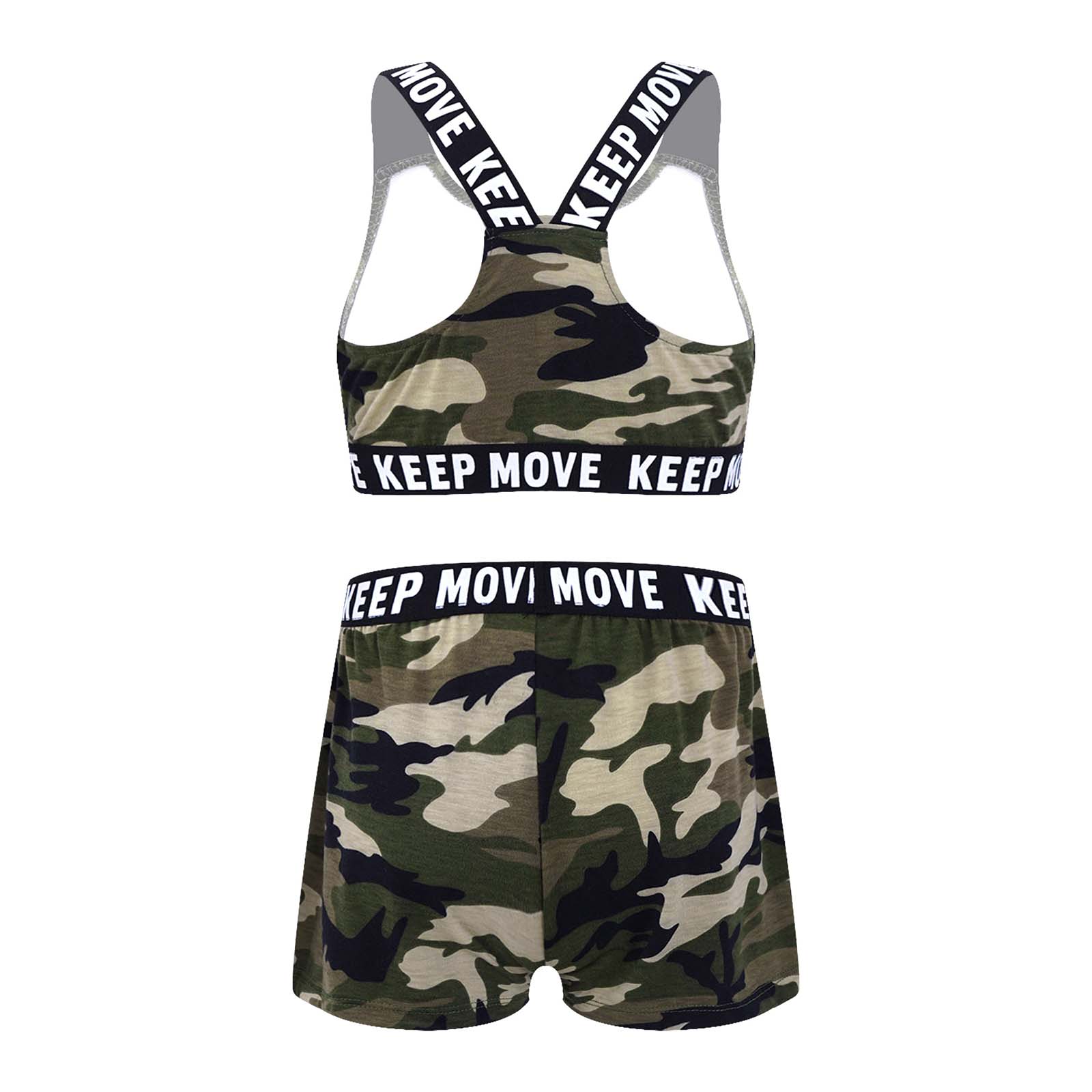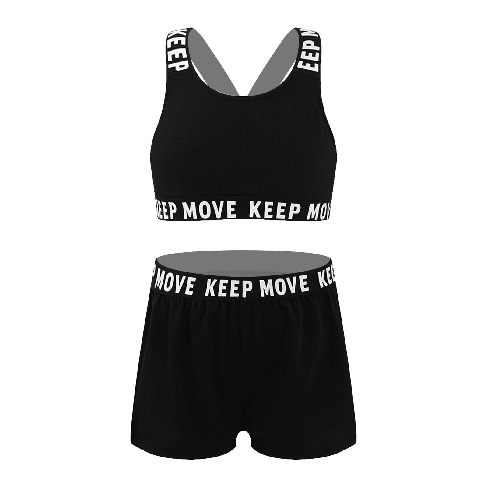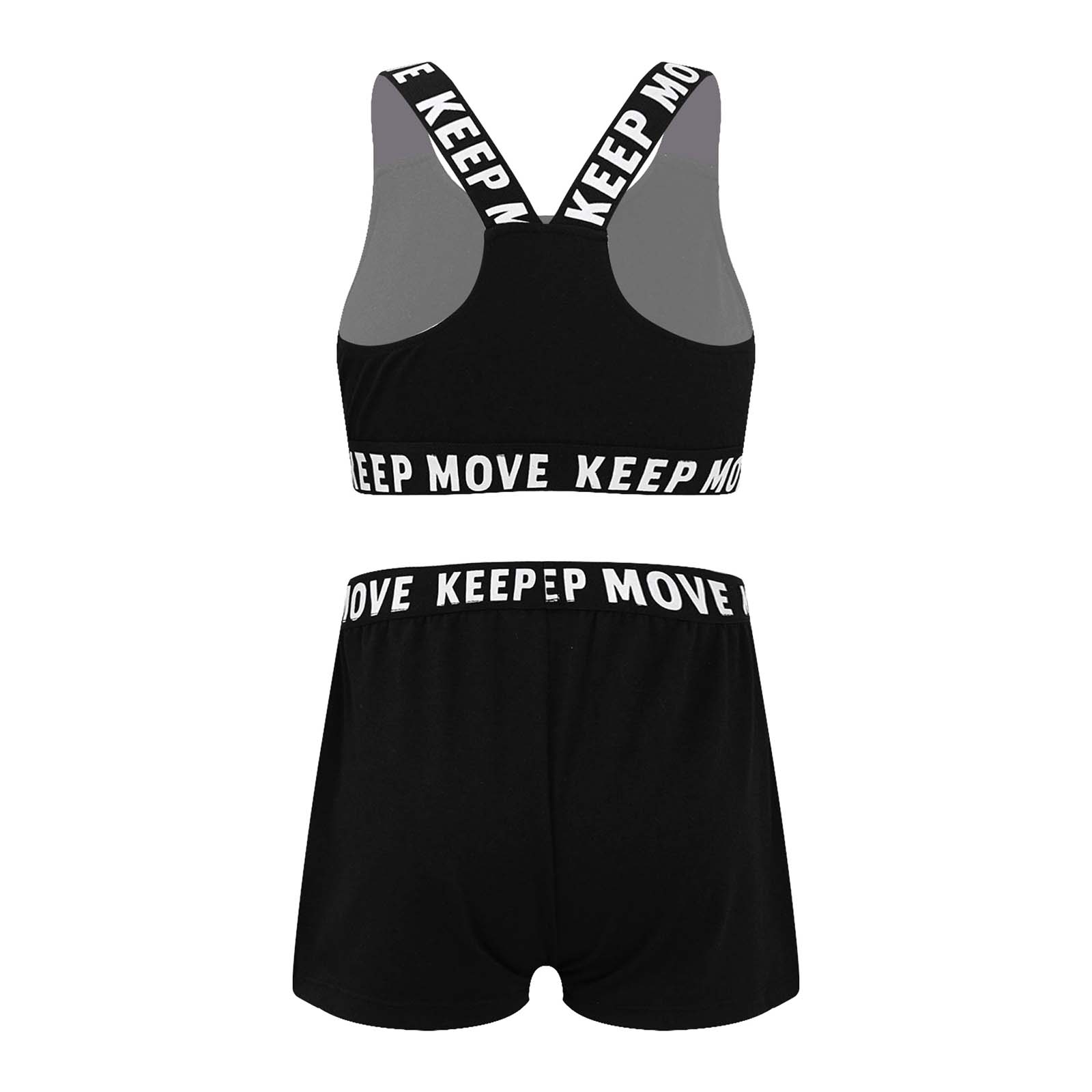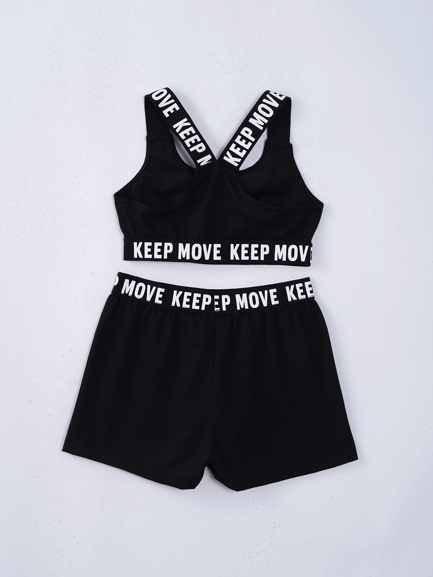 И надпись «KEEP MOVE», напечатанная на лямках и под бюстом топа, и шорты на поясе. Которая сделает вашу девочку более энергичной.