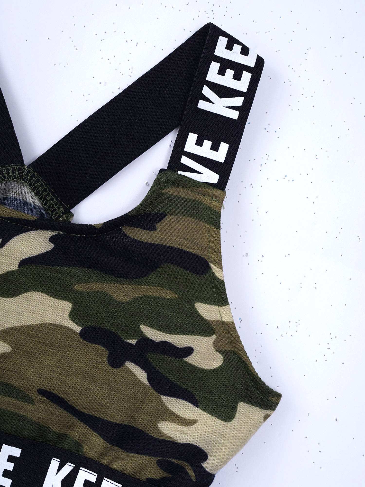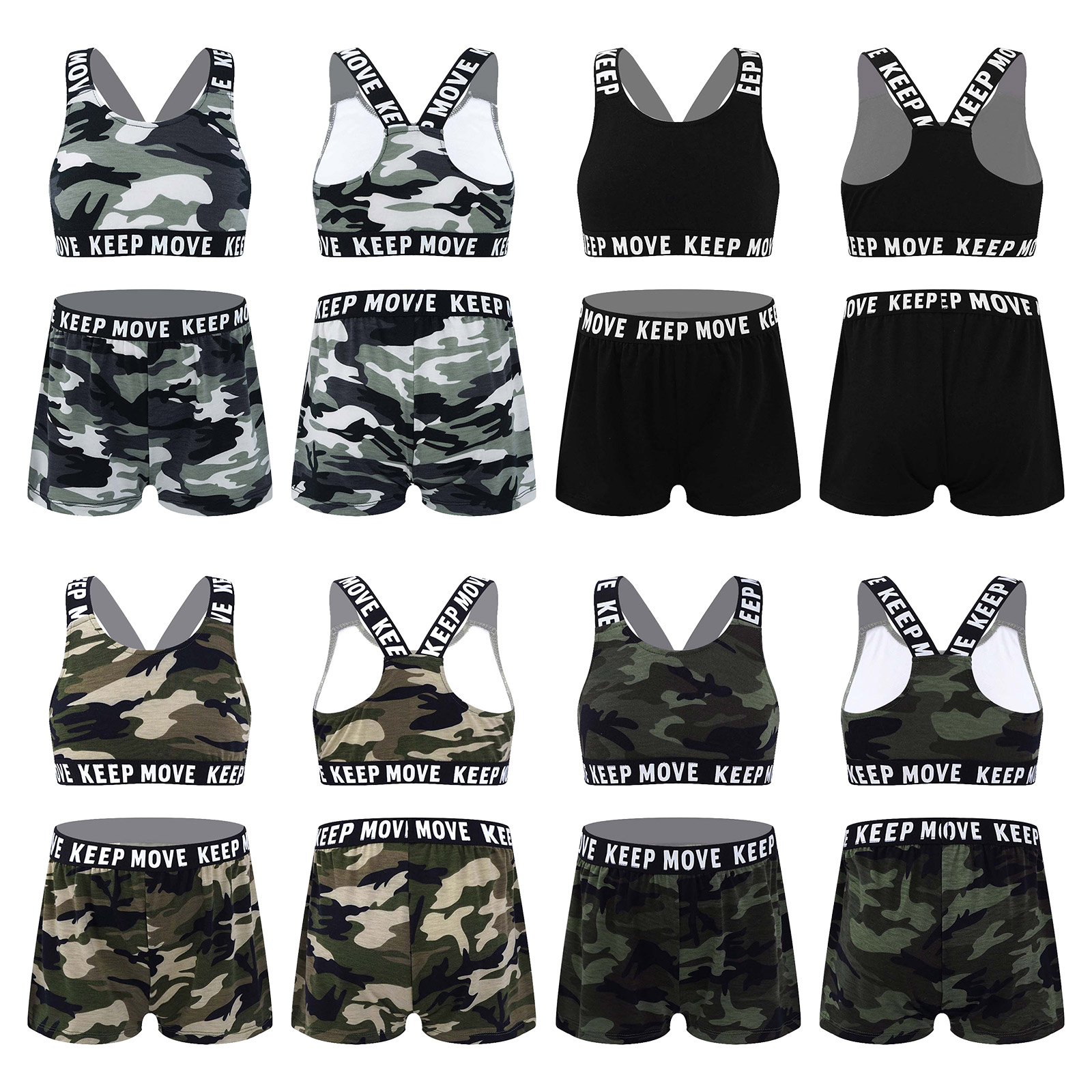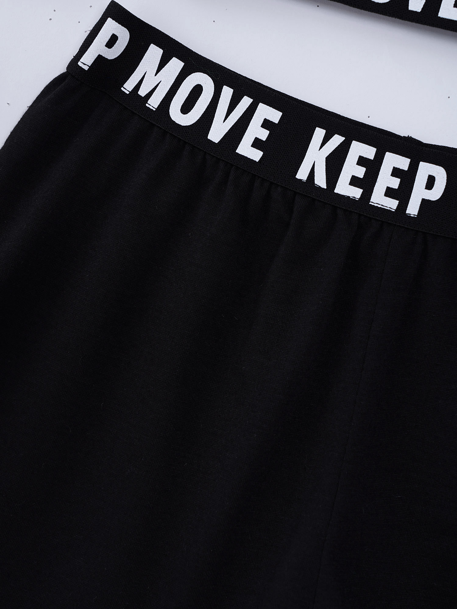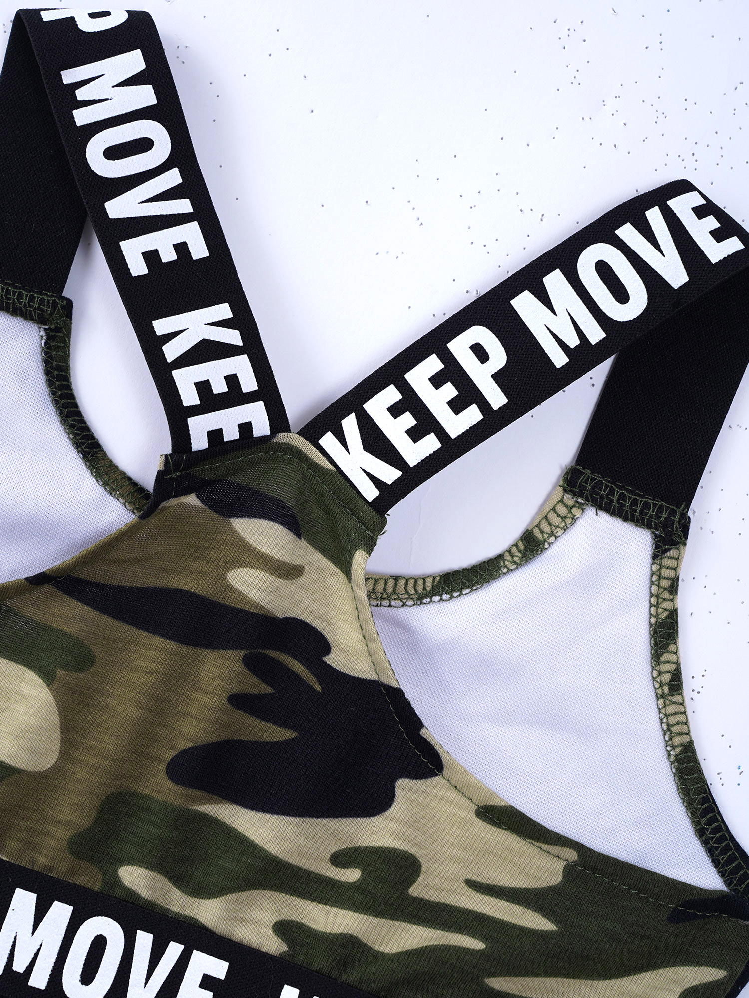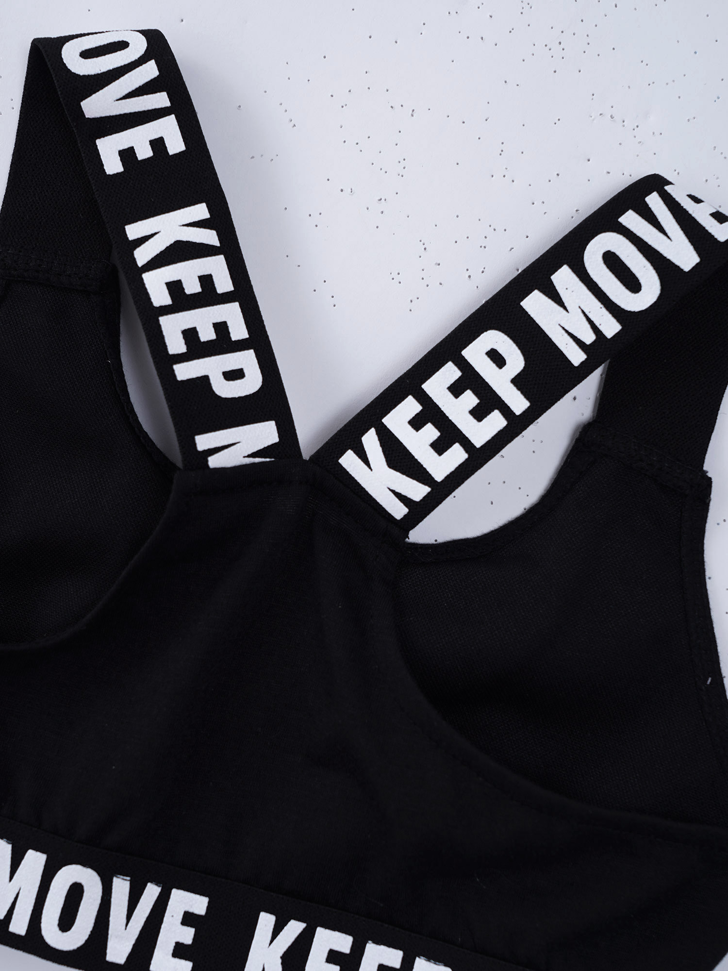 И надпись «KEEP MOVE», напечатанная на лямках и под бюстом топа, и шорты на поясе. Которая сделает вашу девочку более энергичной.