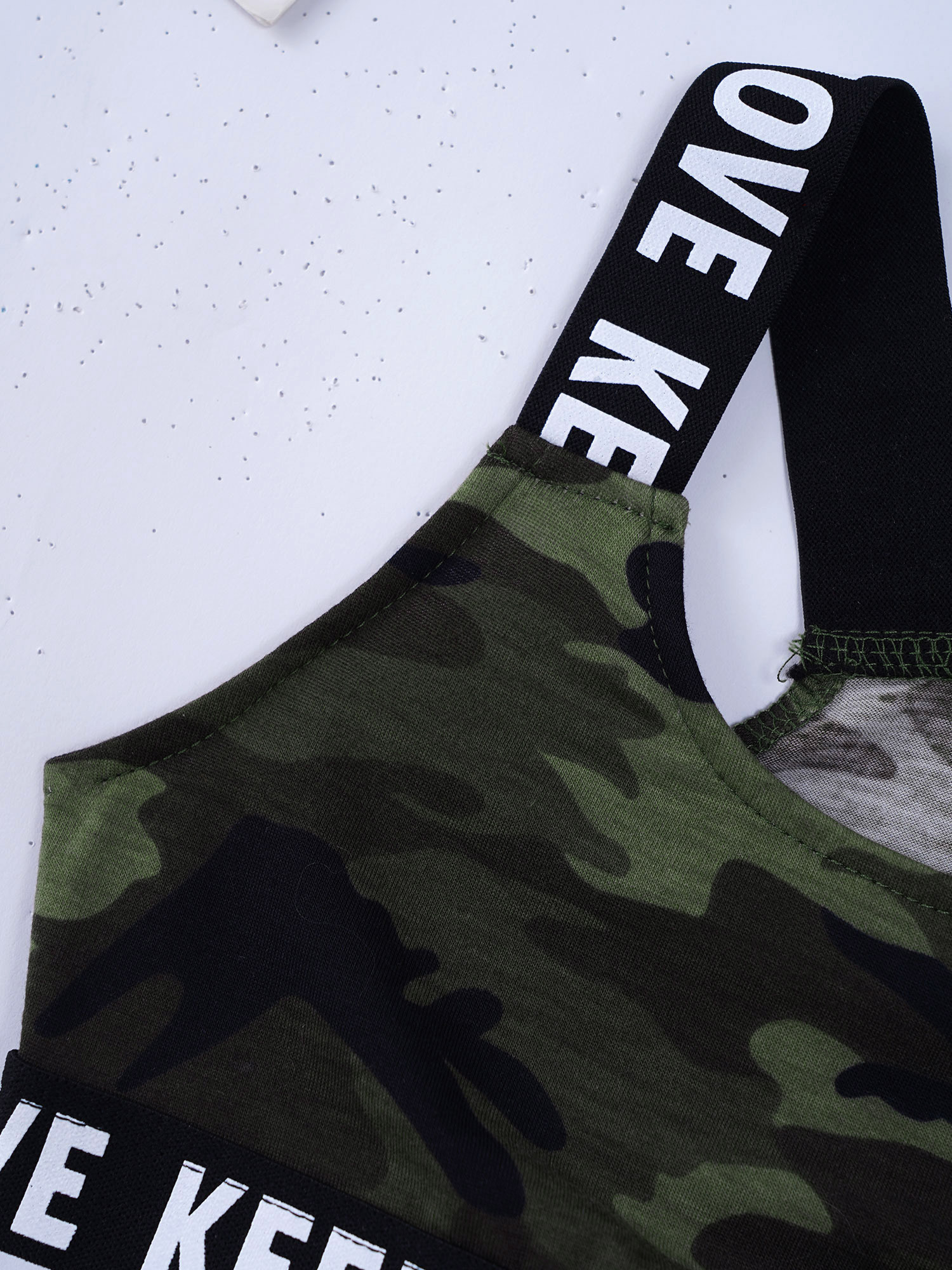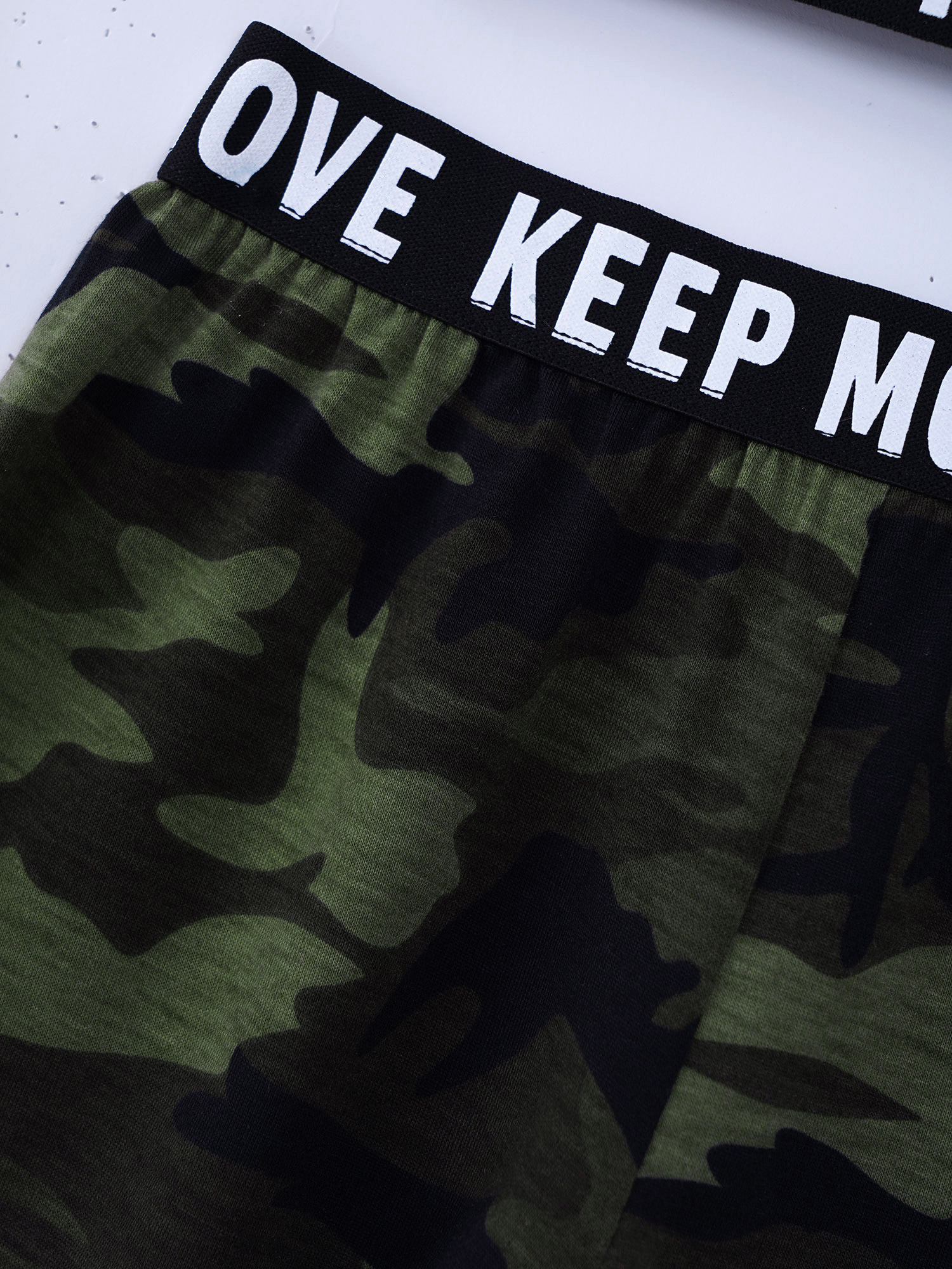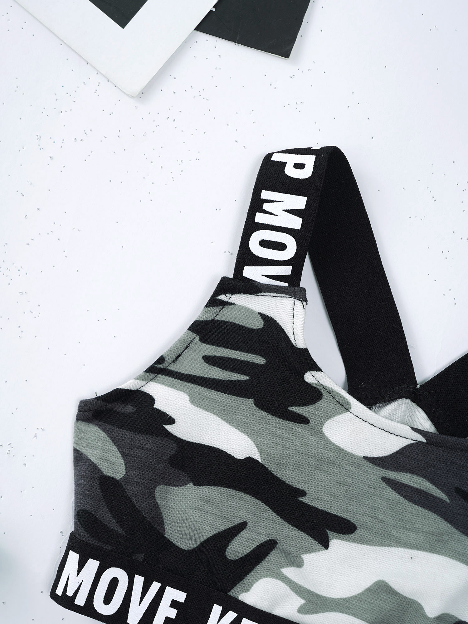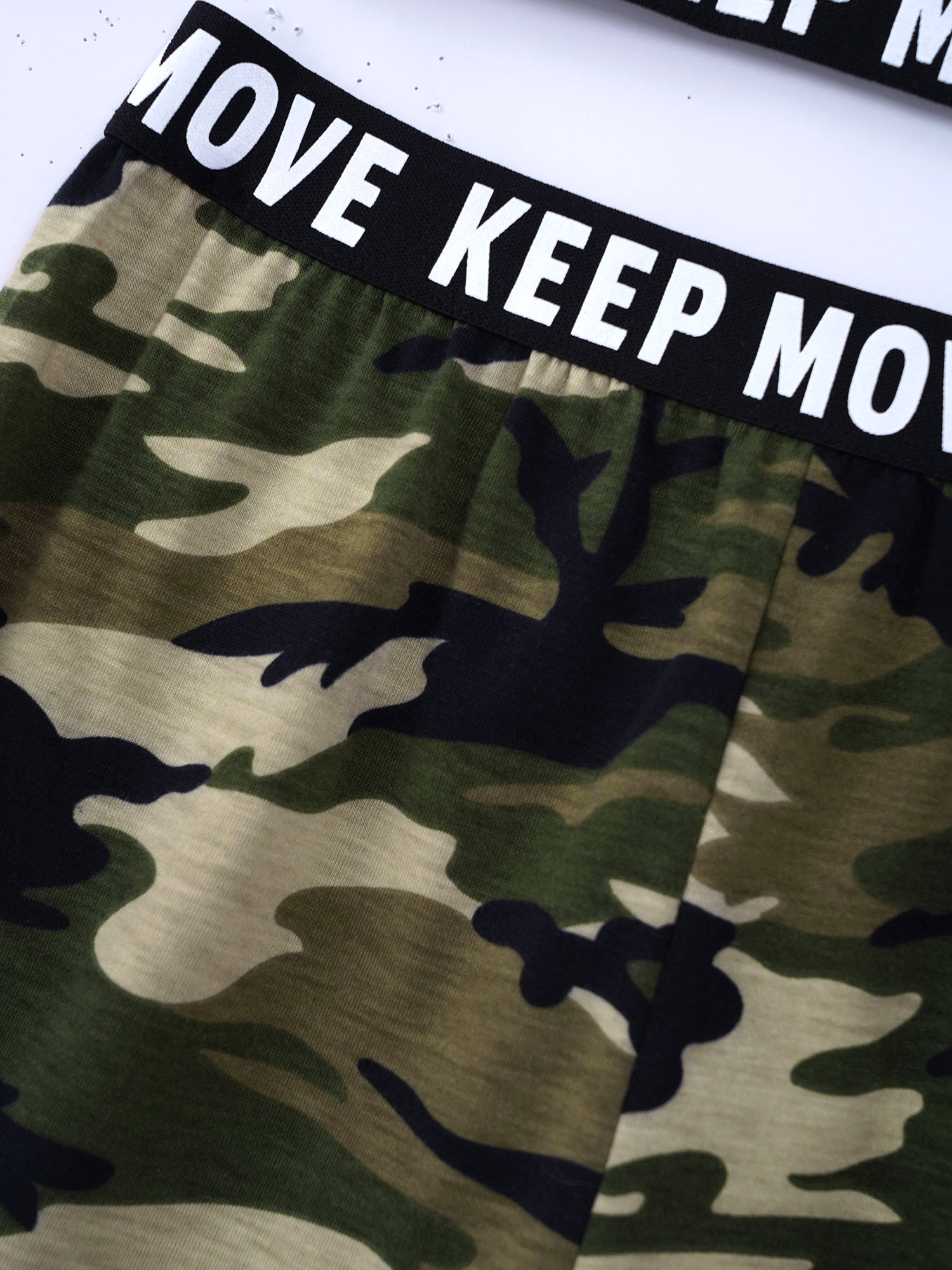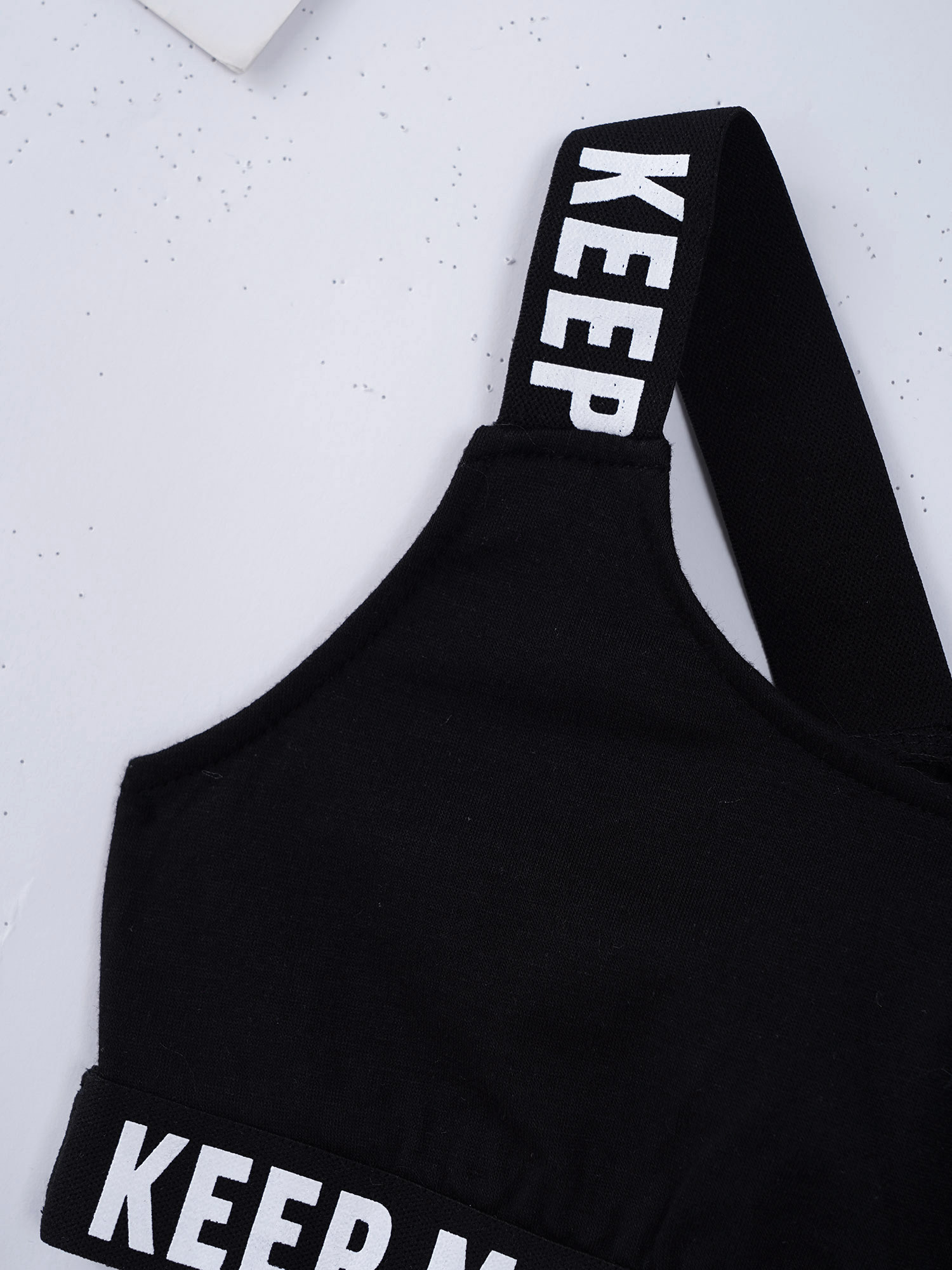 И надпись «KEEP MOVE», напечатанная на лямках и под бюстом топа, и шорты на поясе. Которая сделает вашу девочку более энергичной.