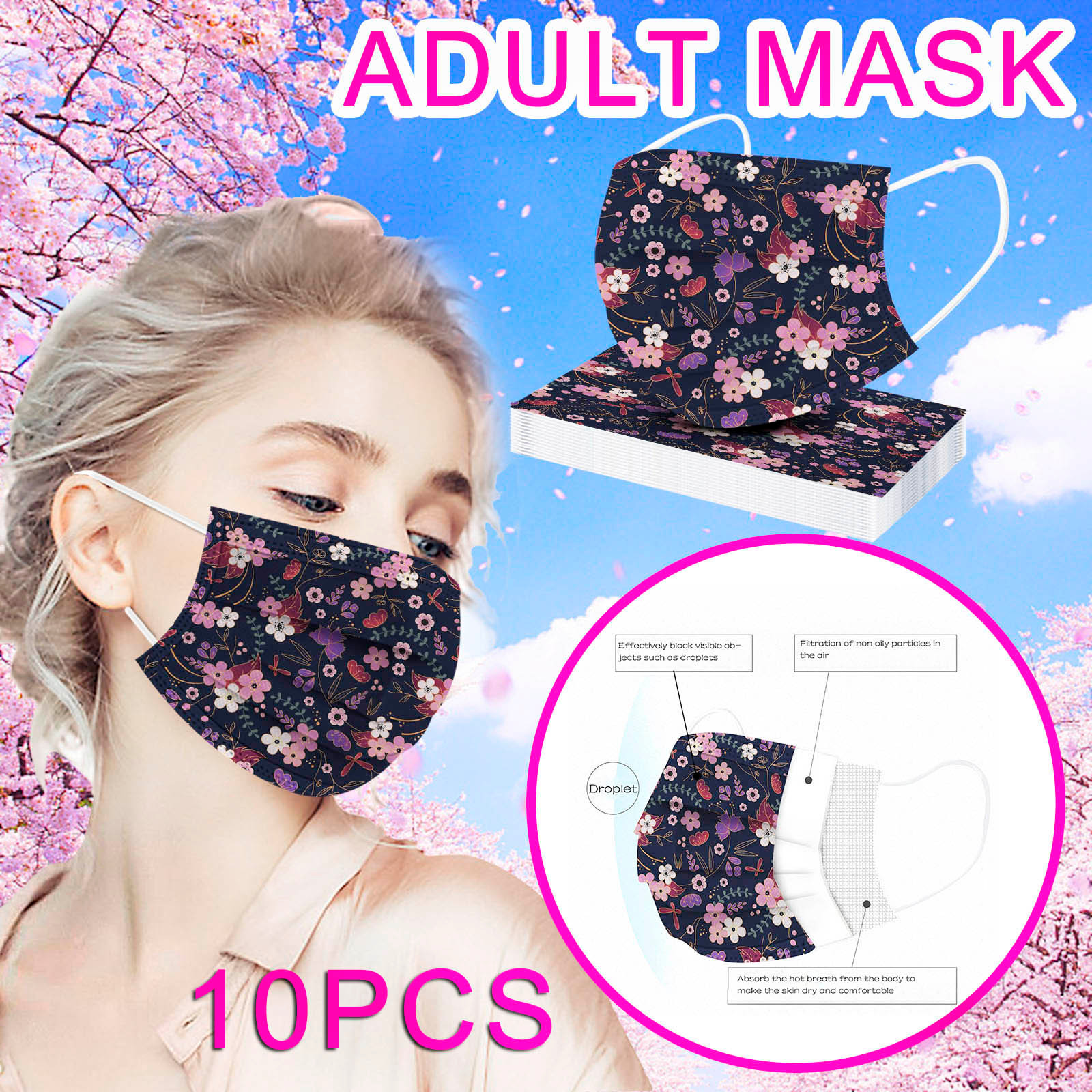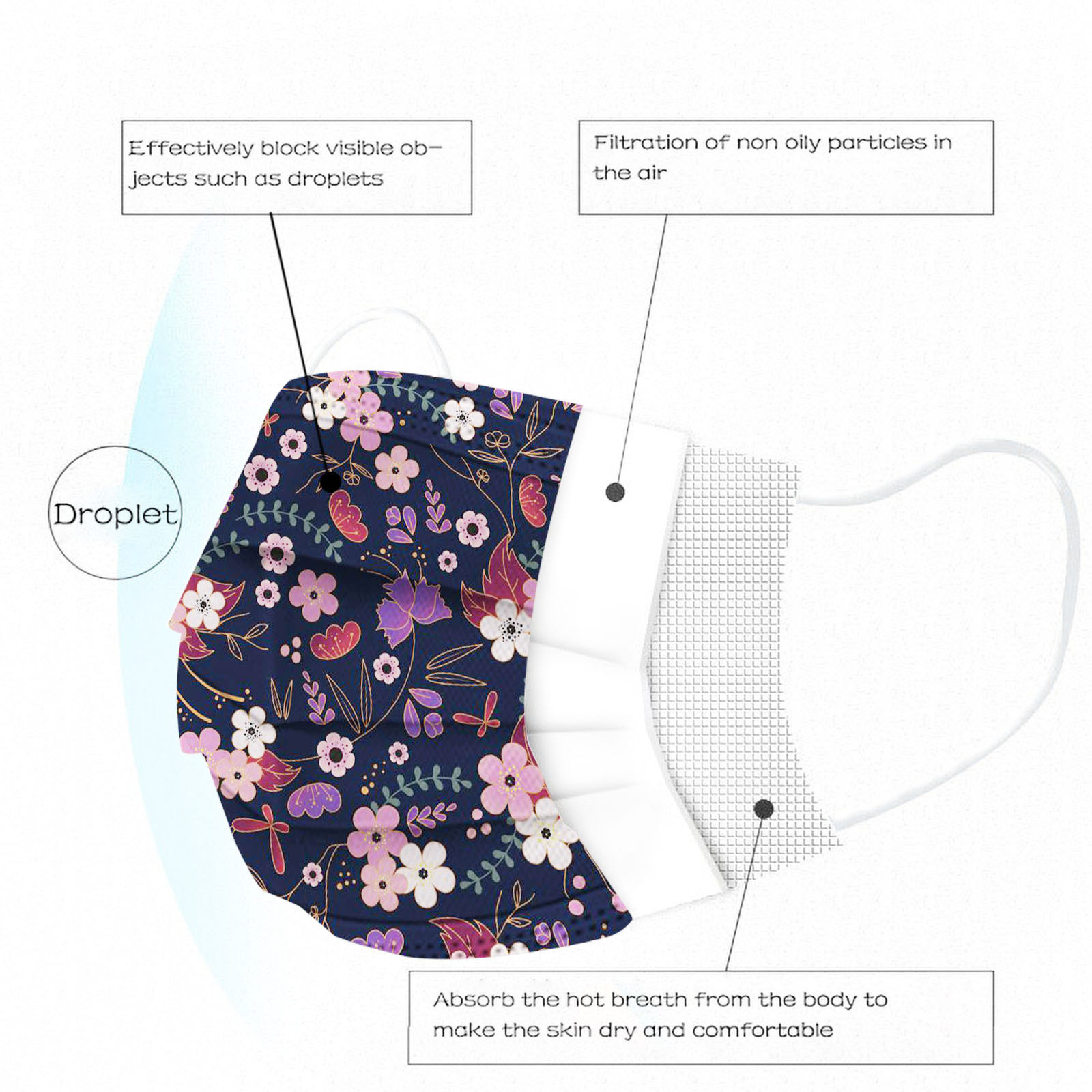 В 3 слоя Нетканая одноразовая маска изготовлена из 3 слоев нетканого материала, Безопасен и безопасен для использования. Дышащий материал и милый Узоры, которые делают его полезным и модным. Специальный 3 слоя из нетканого материала Дизайн, обеспечивает некоторую защиту от пыли, автомобильных выхлопных газов, Пыльца и т. д. эластичная Ушная петля, легко носить и не давит на уши. Маникюрный салон или любые другие области, где может потребоваться защита