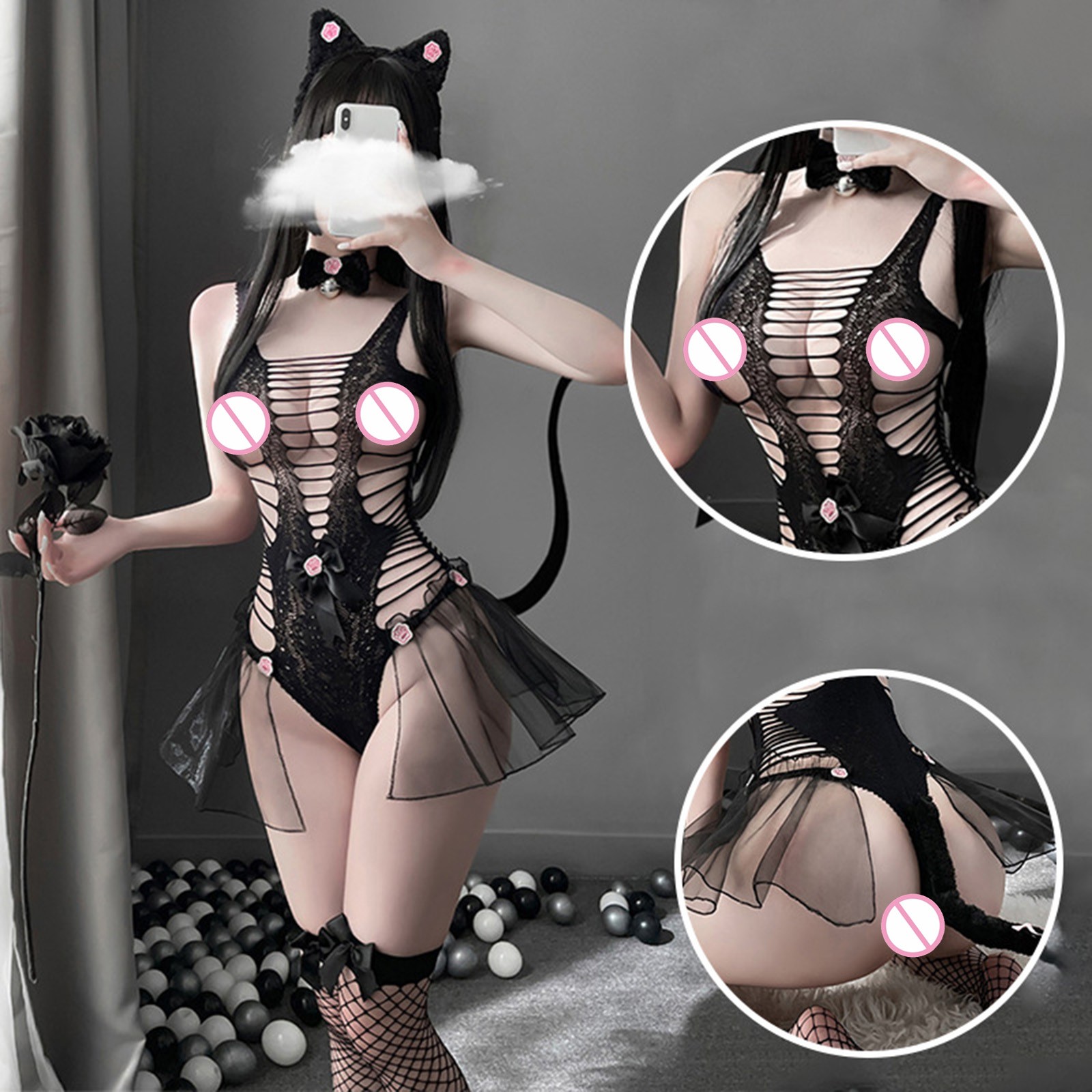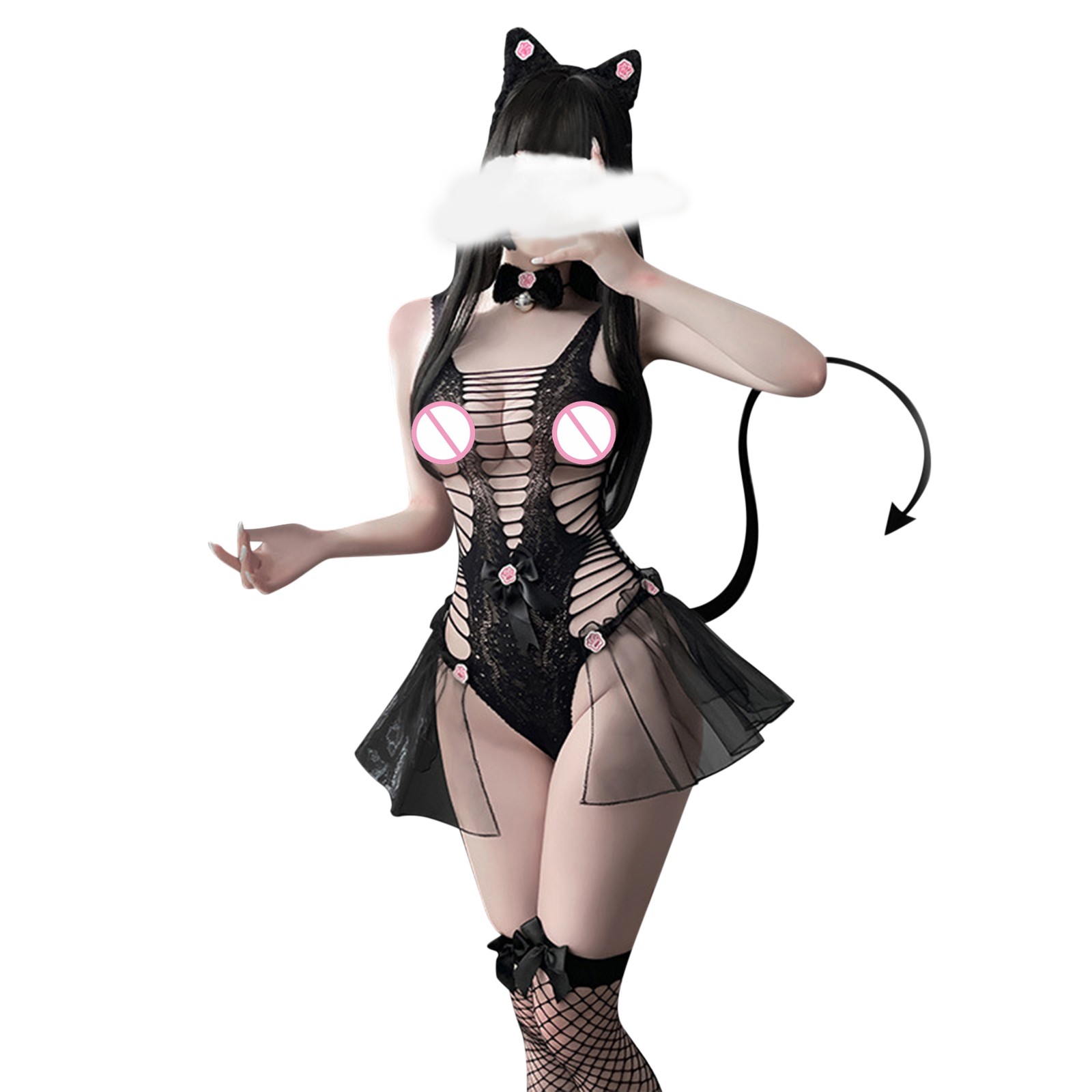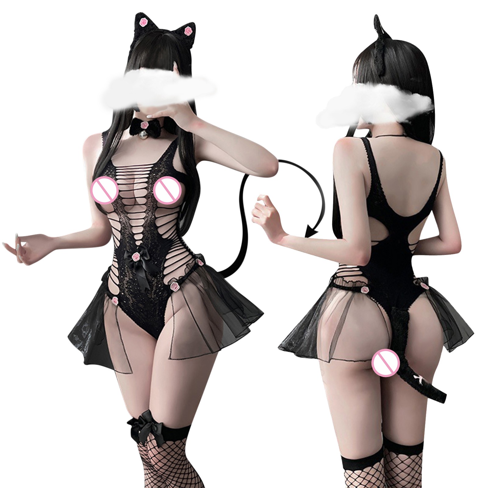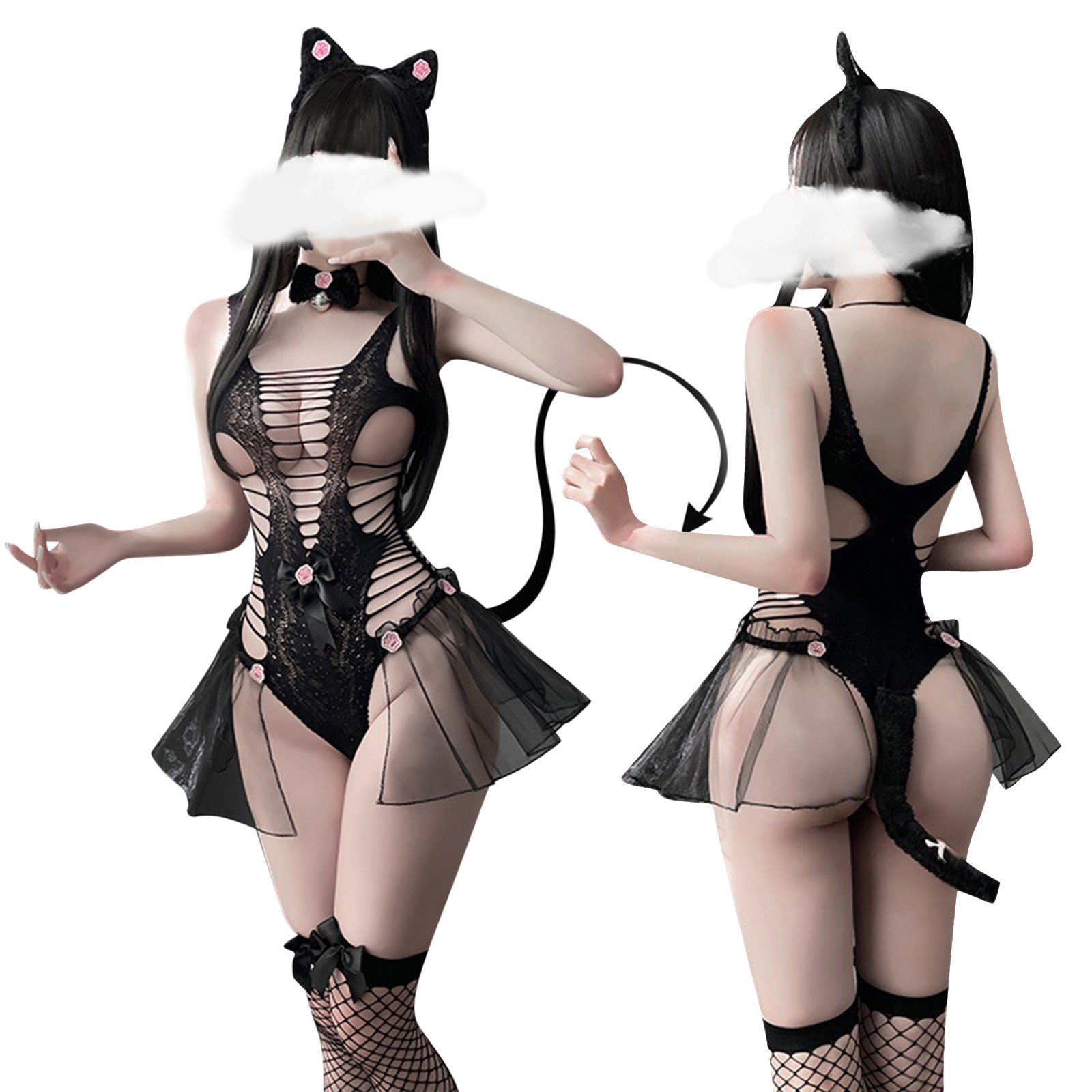 Женское сексуальное цельное сексуальное нижнее белье с маленькими дикими кошками, женское открытое черное кружевное прозрачное кошачий боди, косплей эротический костюм, Порно P