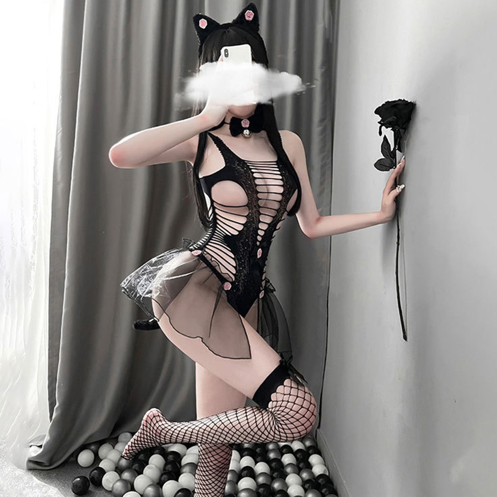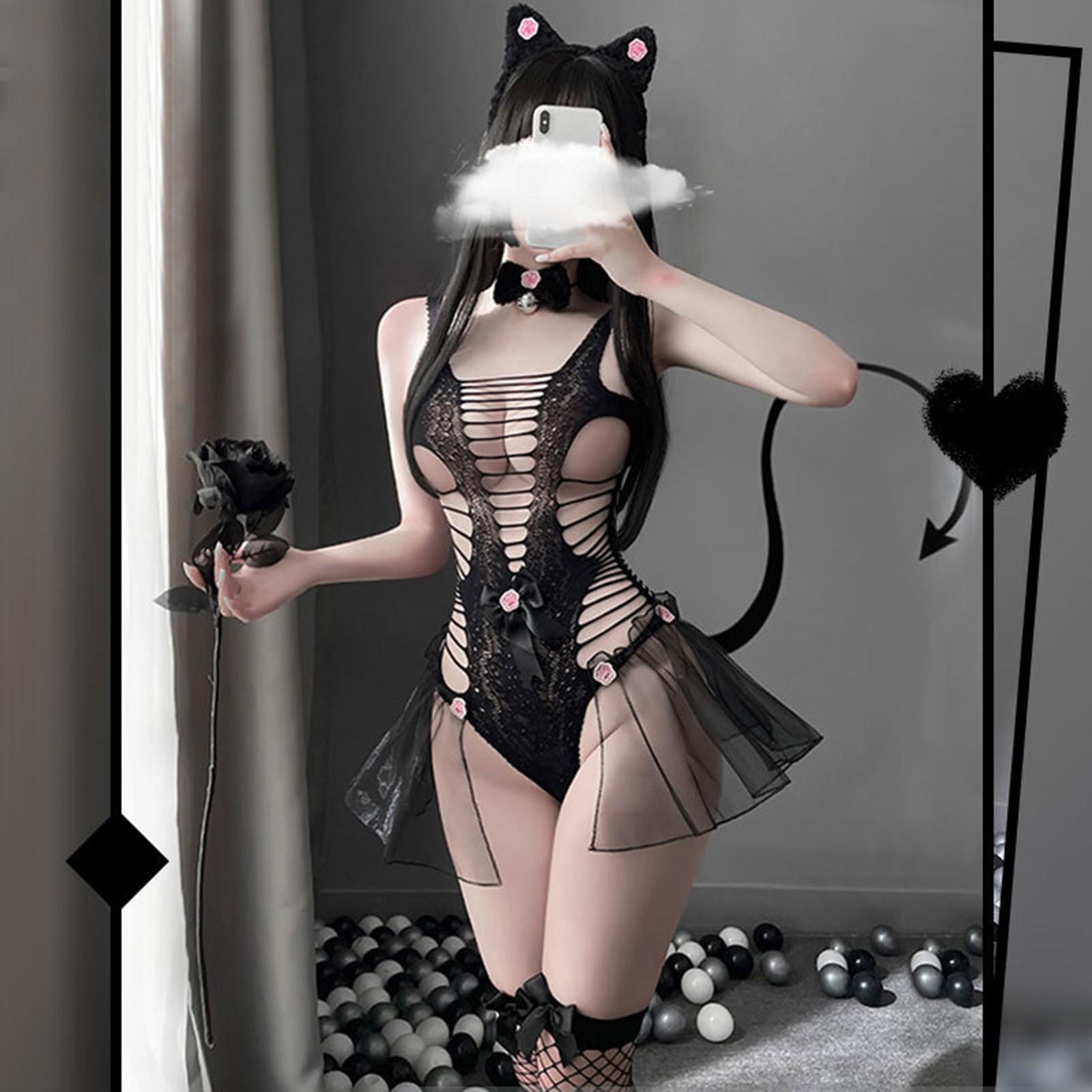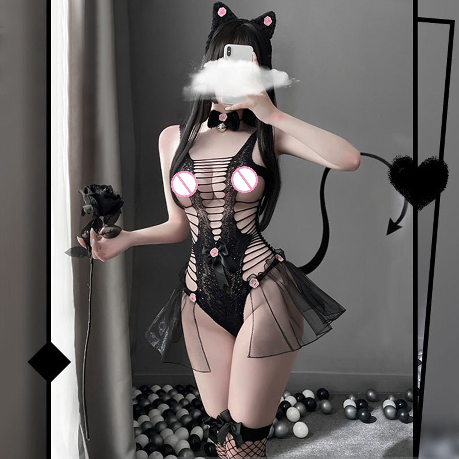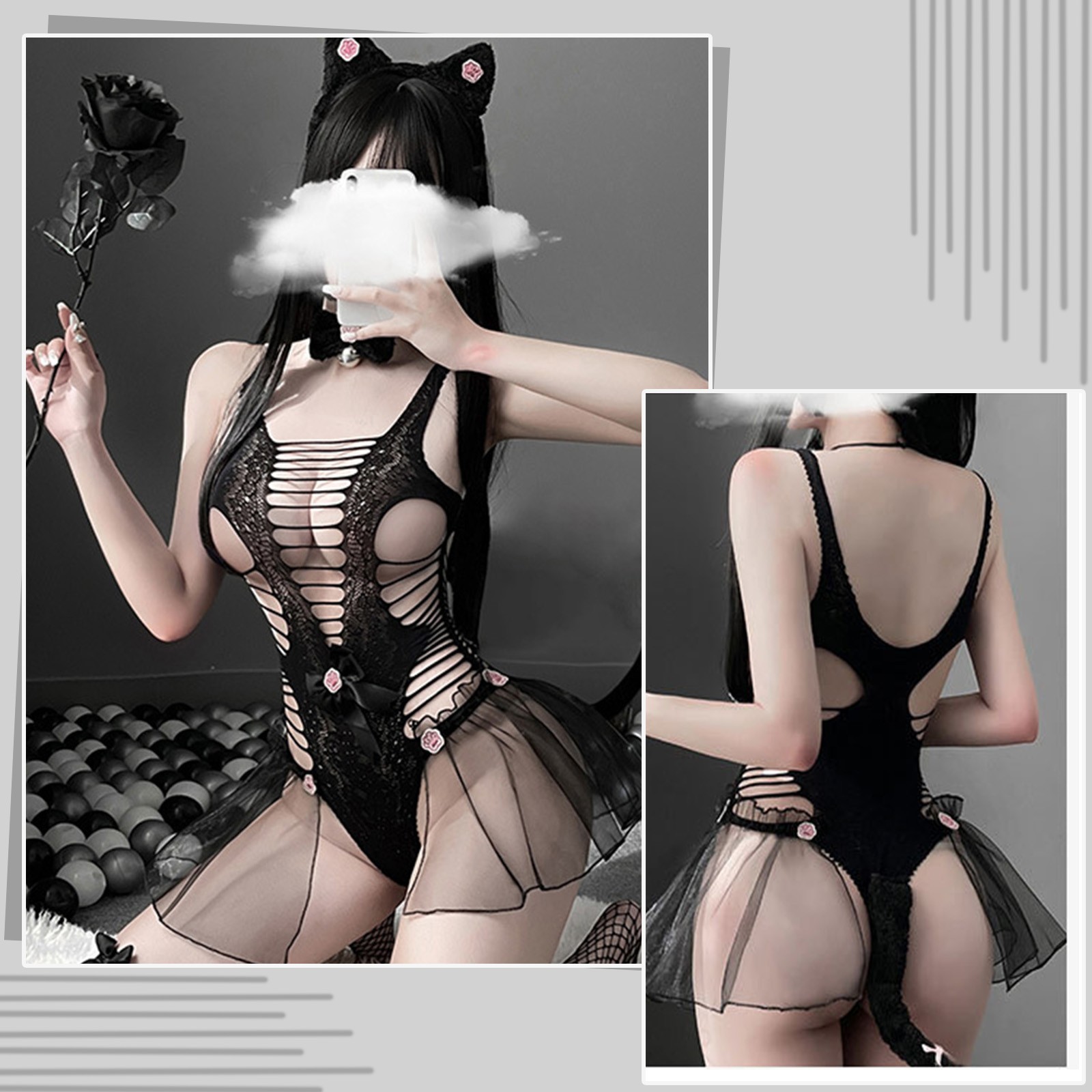 Женское сексуальное цельное сексуальное нижнее белье с маленькими дикими кошками, женское открытое черное кружевное прозрачное кошачий боди, косплей эротический костюм, Порно P
