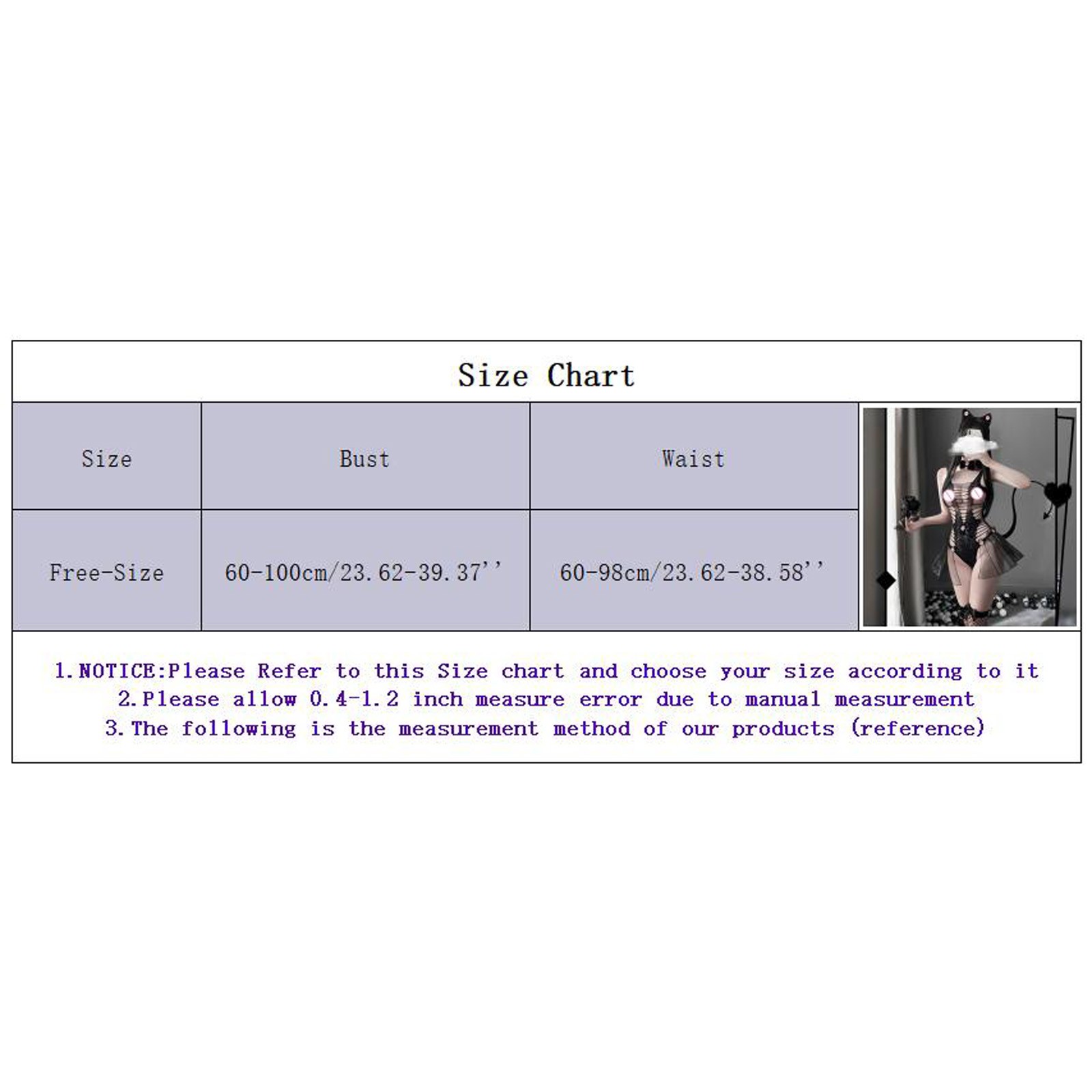Размеры Бюст Талия Свободный размер 60-100 см/23,62-39,37'' 60-98 см/23,62-38,58''