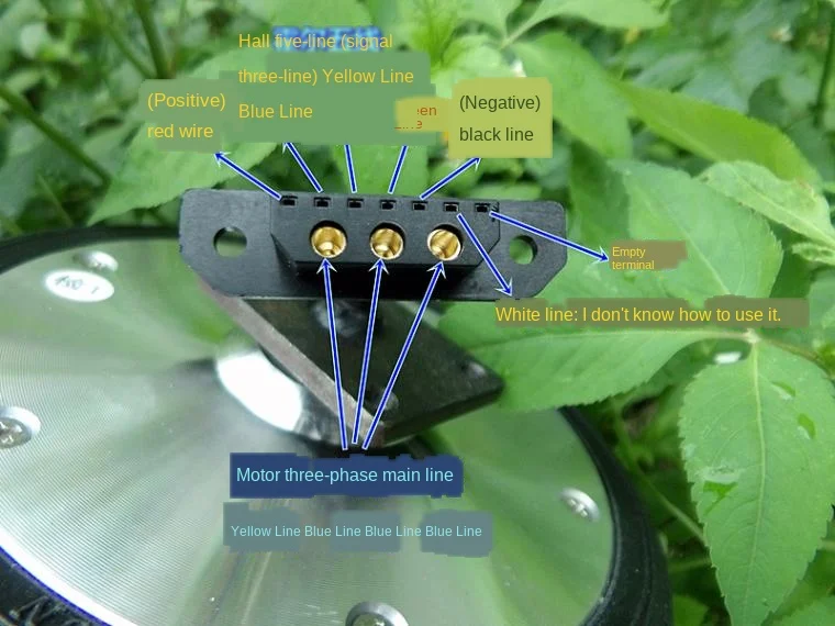 Общий зал состоит из пяти линий, мы также не знаем, что этот моторный зал состоит из шести линий, включая белую линию, не ясно, какова цель, не может удовлетворить, только по пяти другим линиям возможна нормальная работа, красный к аноду, черный соединяет катод, желтую линию, синюю линию, Синяя линия-это сигнальные линии зала соответственно, плюс внешние три толстые линии-это Трехфазная линия машины.