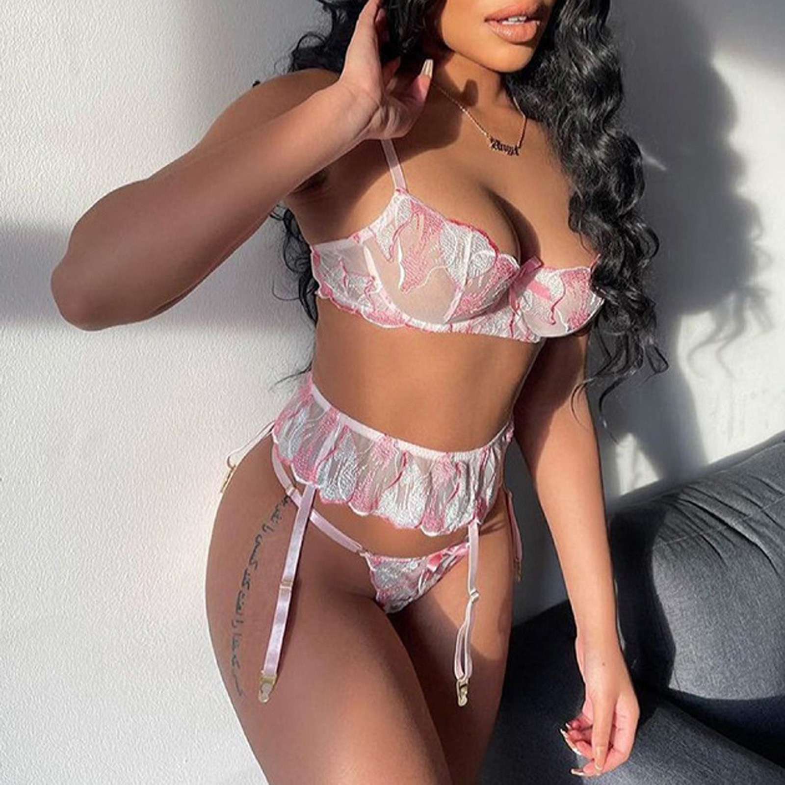 Женский сексуальный модный розовый кружевной костюм с вышивкой