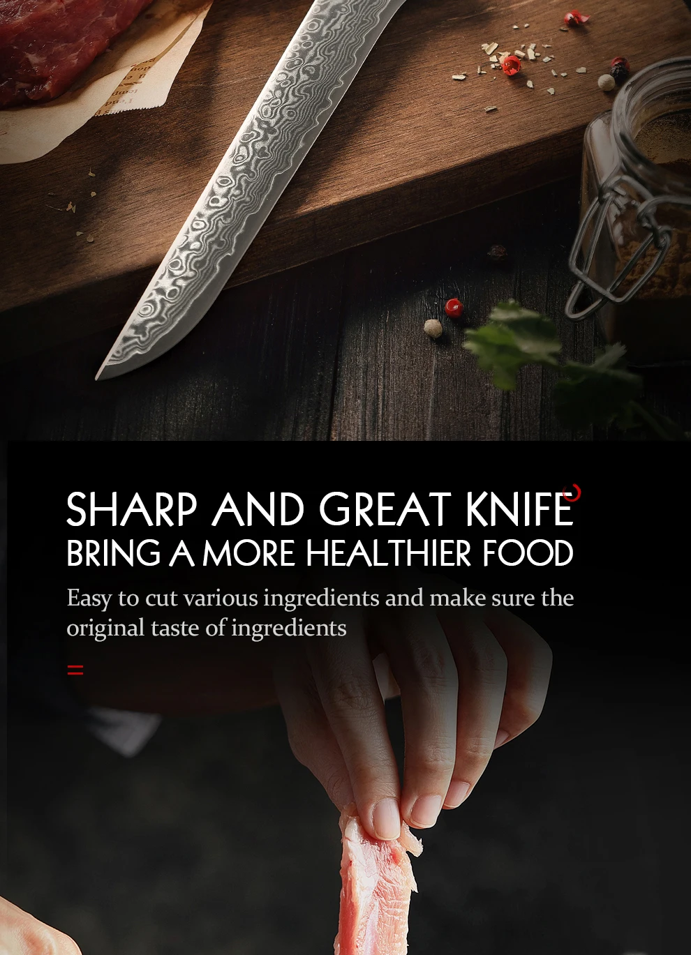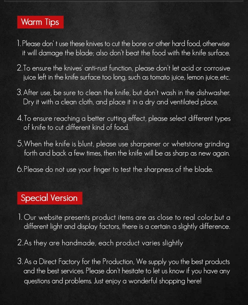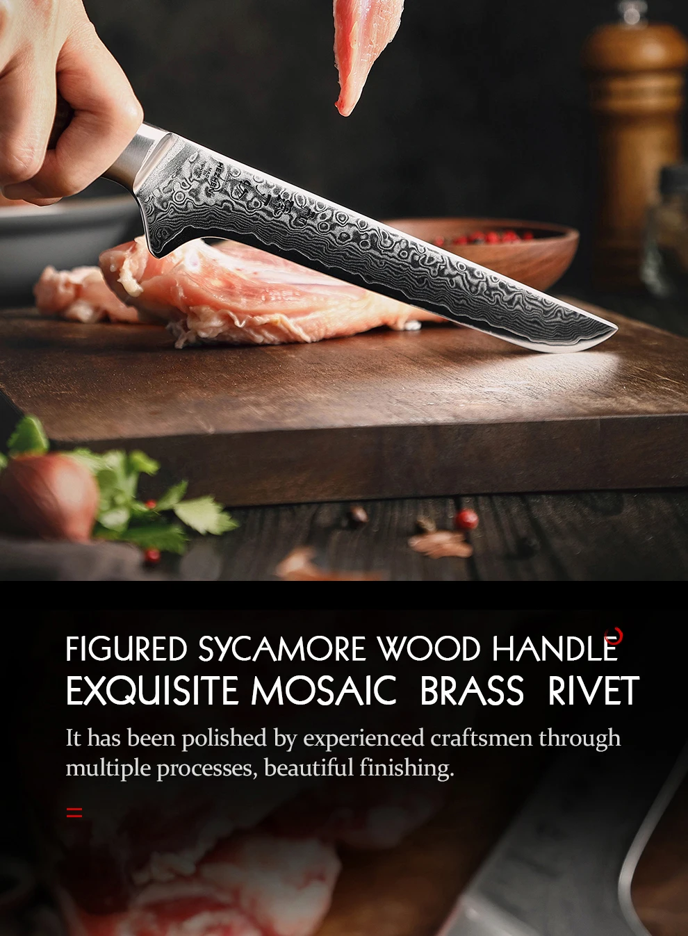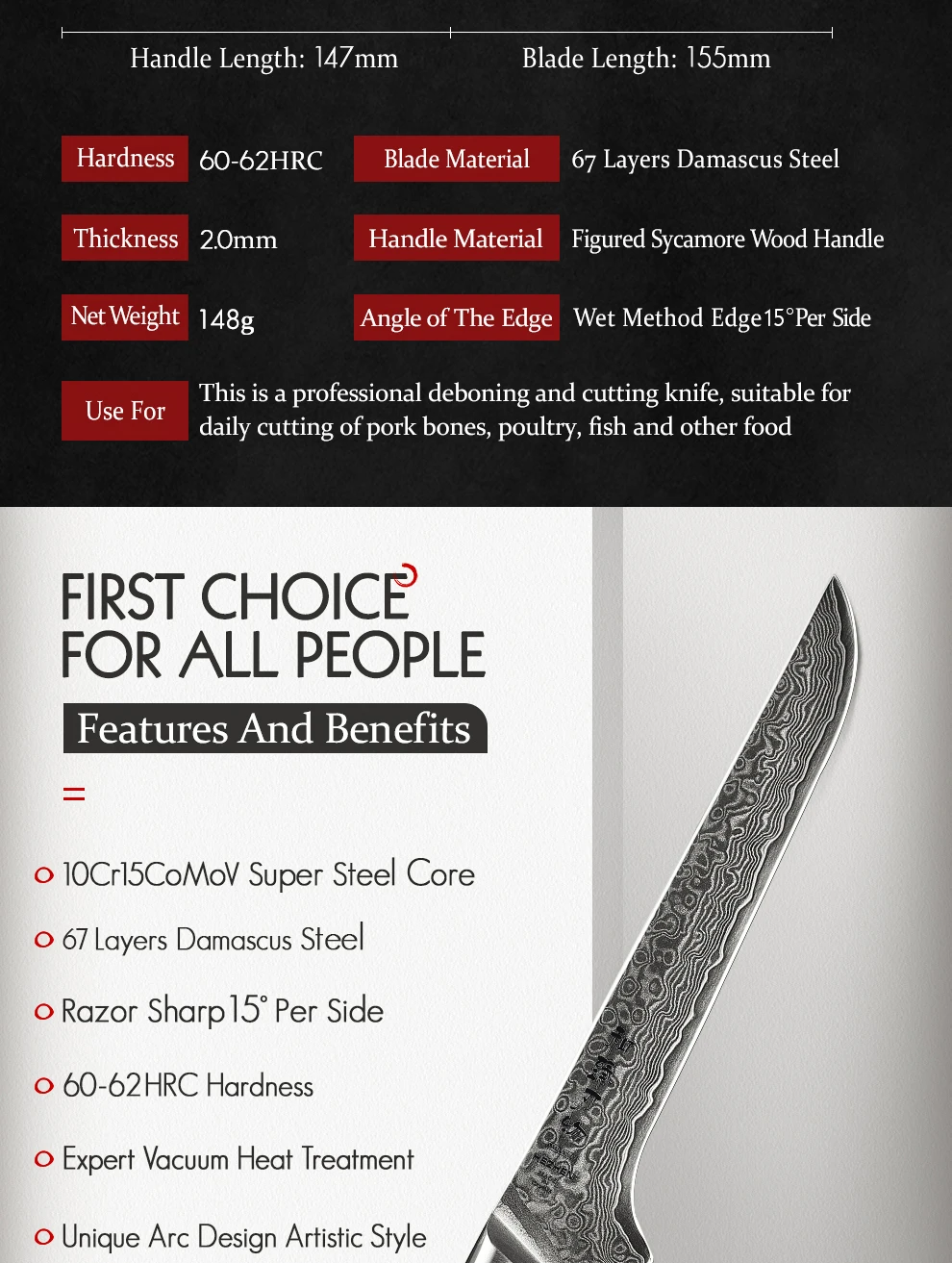 Материал лезвия:67 слоев Дамасская супер стальСтальной сердечник:10Cr15CoMoV core steelТехнология термической обработки: Вакуумная термообработкаМатериал ручки:Высококачественные фигурные деревянные ручки sycamore и мозаичные латунные заклепкиТвердость сердечника:60-62 HRCУгол края:15 градусов наБоковая сторонаОбработка поверхности:Полировальная обработка, высококачественный внешний видХарактеристики:Острый и прочный, супер антикоррозийный светильникУровень резкости:Уровень силы резания: 6,0-8,0 N международные стандарты.Упаковка:Красивая подарочная коробка.