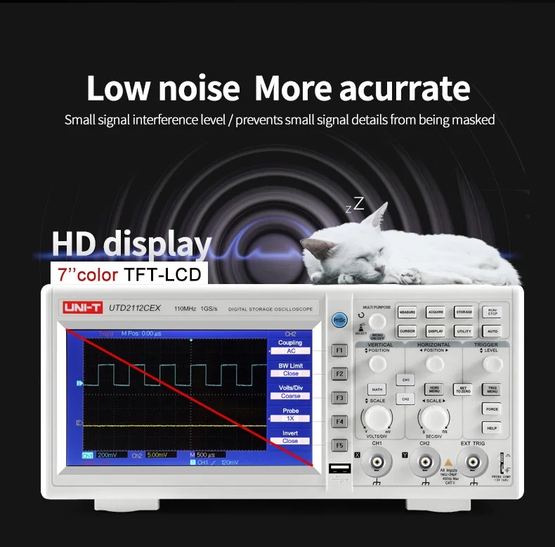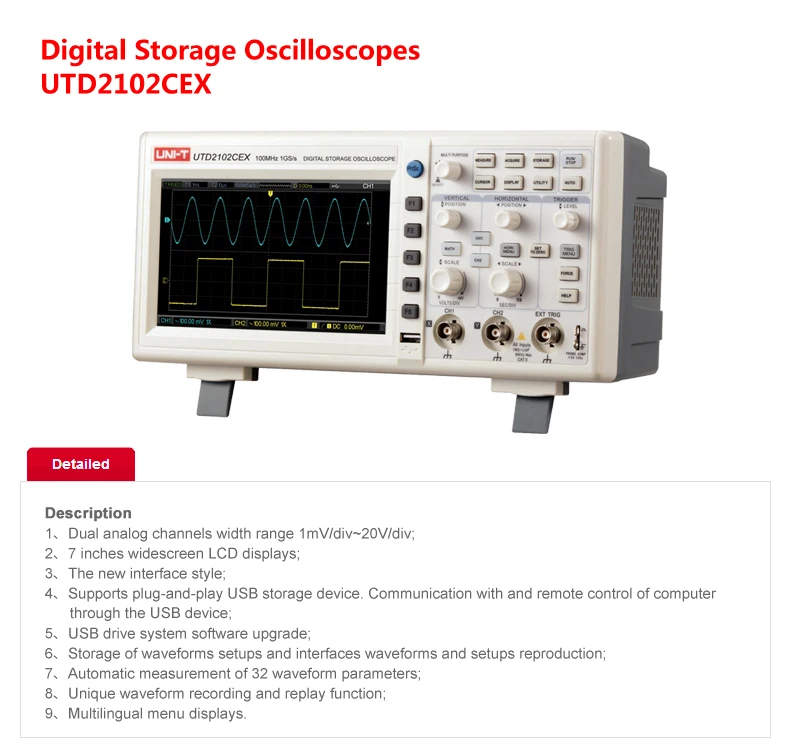 1. 2 канала, Широкий вертикальный диапазон: 1 мВ/div ~ 20V/div