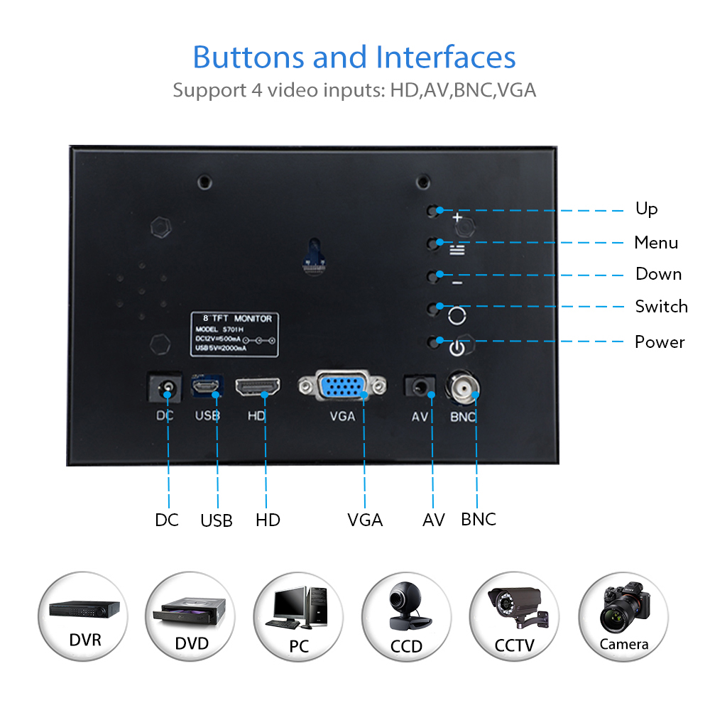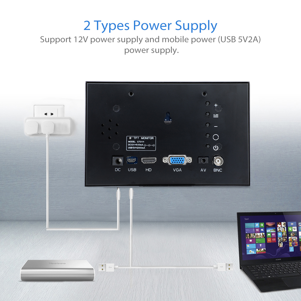 Мини-монитор EYOYO 8 дюймов IPS с разрешением 1024x768, поддержка VGA,AV,BNC,HD,Ypbpr пять видео входов, может удовлетворить различные потребности различных профессиональных приложений отображения, таким образом, вы можете легко расширить удовольствие от многих устройств на дисплее full HD. Он поддерживает 2 типа источника питания, 12 В постоянного тока и USB 5 в 2 а питания, очень удобно для вас.