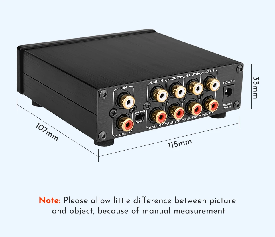 1.Один вход и четыре выхода, каждый выходной объем самостоятельно контролируется.2. Встроенная схема управления mcu, идеальное управление ударным звуком выключения «стрелы», статическим эффектом выключателя.3. С 10 дБ, Переключатель усиления, вы можете увеличить следующий объем, добавить уровень к устройству с более низким уровнем выхода, увеличить громкость4. Частотная характеристика 20-20 кГц ± 0.1дб, искажение 0.0001% выходной фазы и входной фазы одинаковые5. Каждый канал самостоятельно обрабатываетсяNE5532 op ampИ не мешает друг другу. Вентиляторы могут заменить различные операционные усилители в соответствии с их собственными предпочтениями. Напряжение питания op amp составляет ± 12 В;6. Материал: японский черный алмазный твердотельный фильтрующий конденсатор, бесступенчатый аудио соединительный конденсатор, Tk аудио соединение,7. Позолоченный разъем RCA, хороший контакт, Матовый алюминиевый корпус, лазерная гравировка, высококачественный, красивый, атмосферный8. Напряжение источника питания: DC12V, ток: 1A или более9. Размер около: 117*35*107 ммПосылка включает в себя: