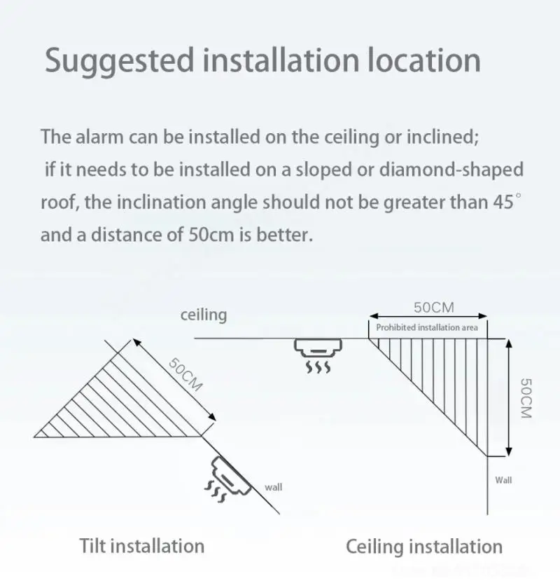 Если потолок наклонен, пожалуйста, установите датчик дыма на горизонтальном уровне 90 см от потолочного ЛоПа.