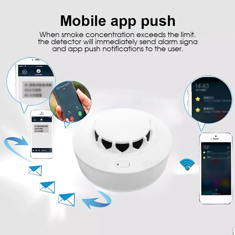 Этот продукт является умным WIFI фотоэлектрическим датчиком дыма. Он способен в режиме реального времени обнаруживать наличие дыма. После обнаружения опасности пожарного дыма, красный светодиодный датчик будет включен, и