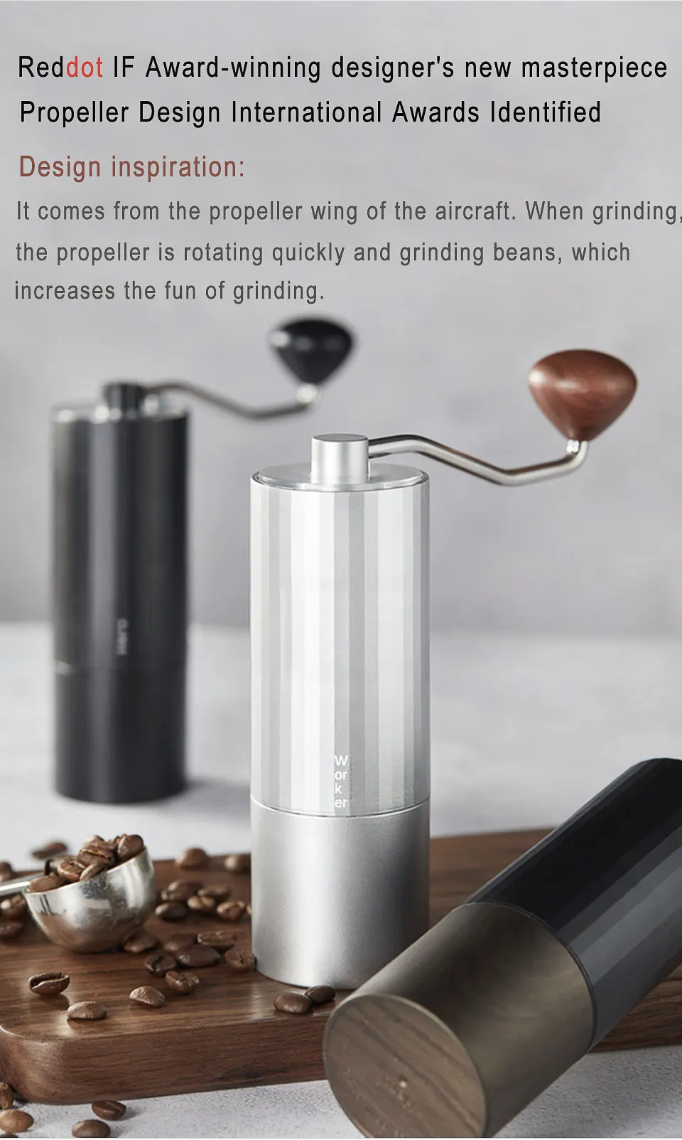 Это происходит из крыла пропеллера самолета. При шлифовке пропеллер быстро вращается и измельчает бобы, что увеличивает удовольствие от шлифования.
