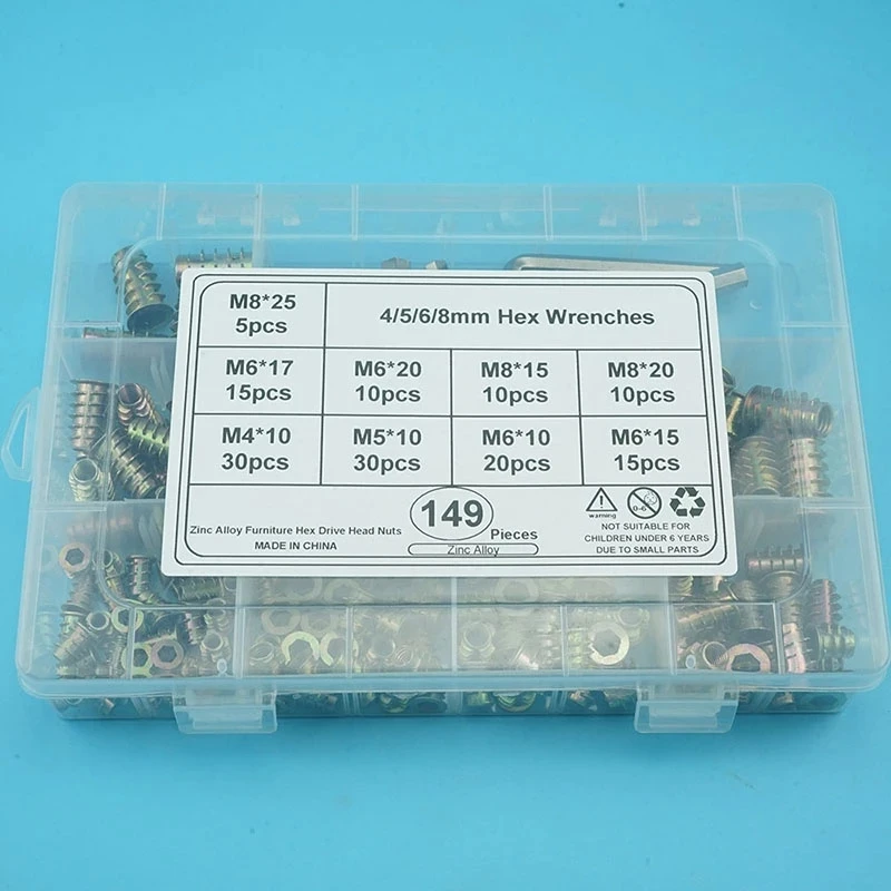 149PCS Flanged Hex Drive Head Furniture Nuts Assortment Kit M4 M5 M6 M8 Zinc Alloy Thread for Wood Insert Nut with 4 Wrenches