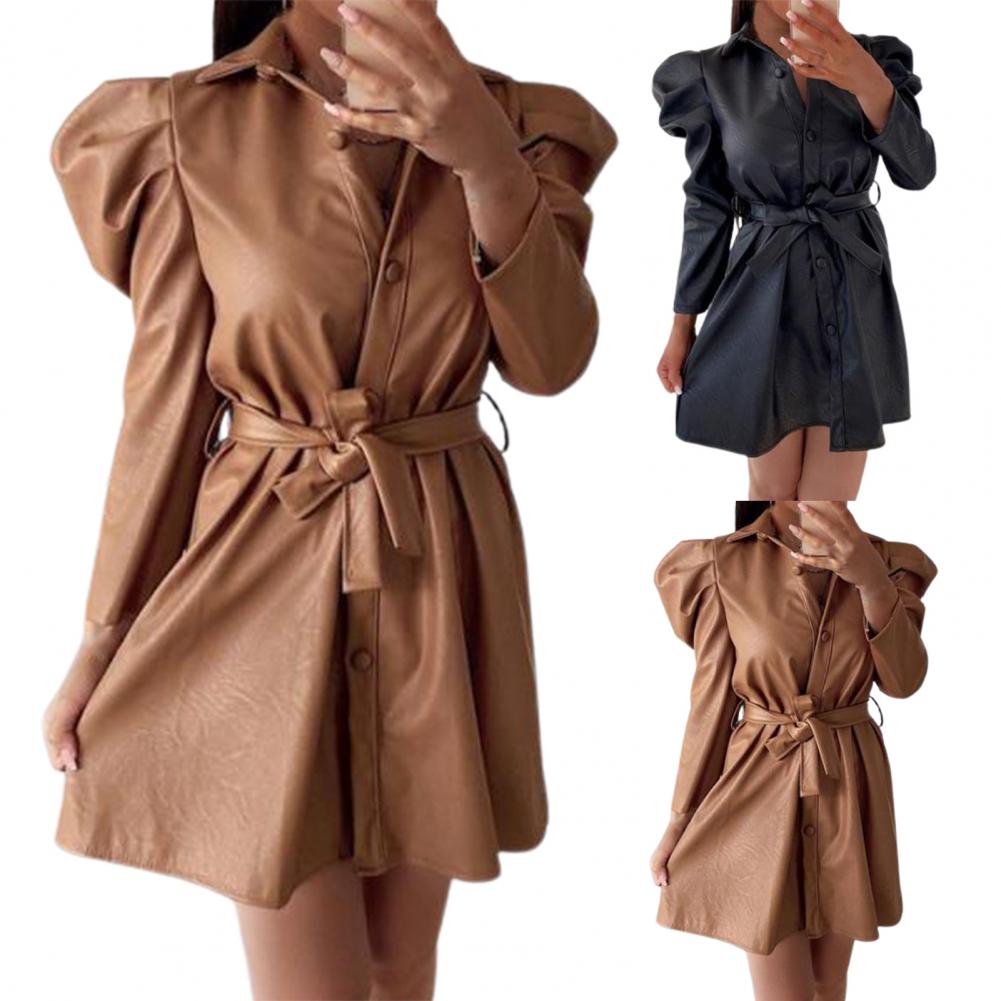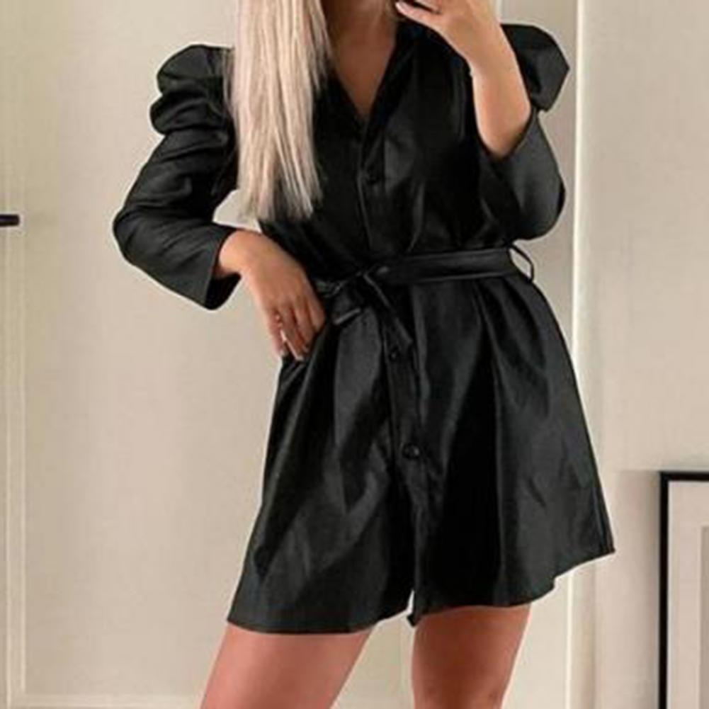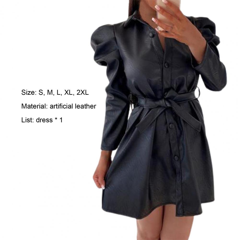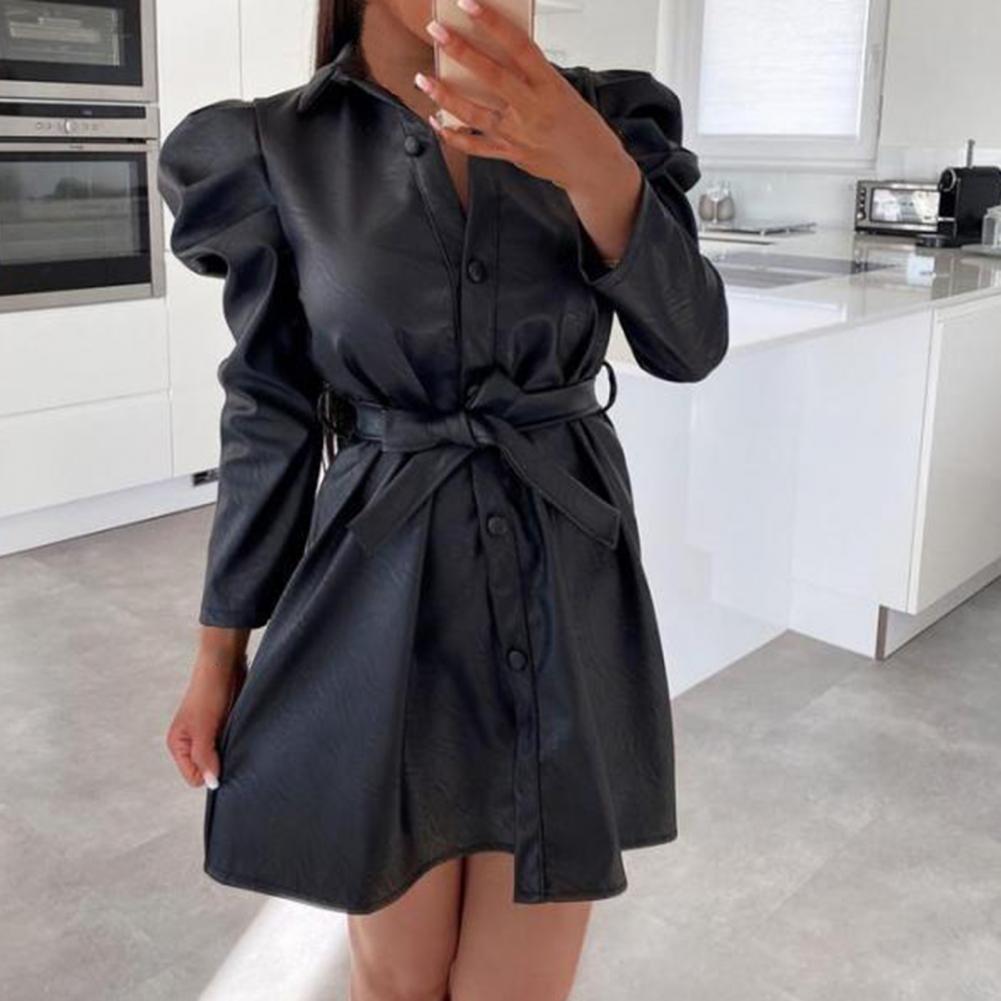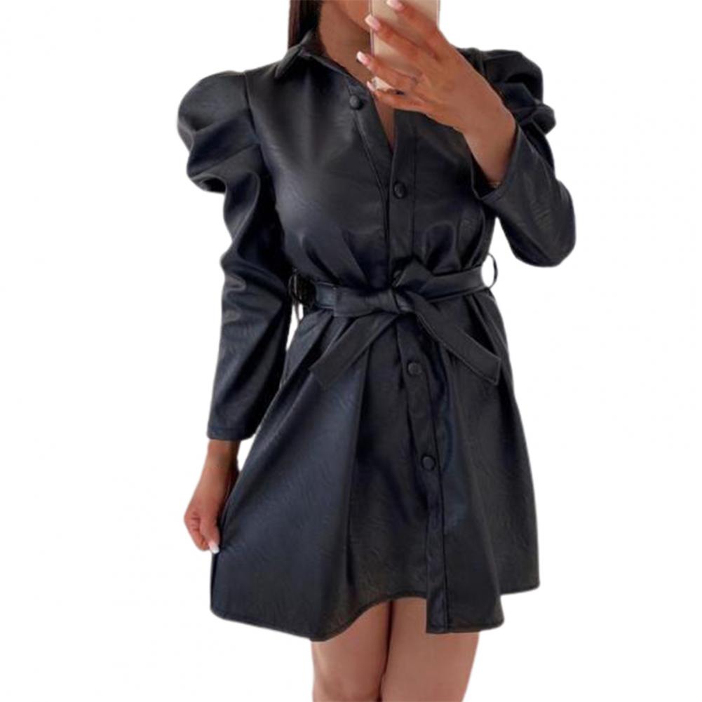 Платье из искусственной кожи с пышными рукавами и поясом; Сезон осень-зима; Однотонное мини-платье с лацканами для повседневной носки