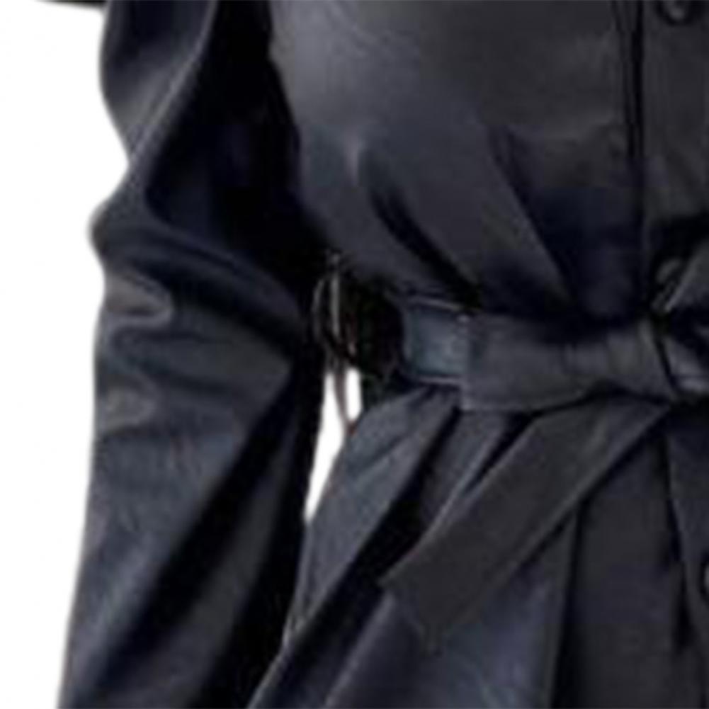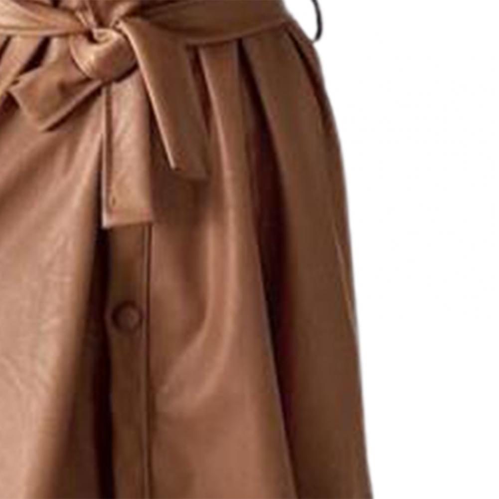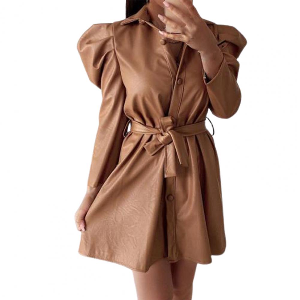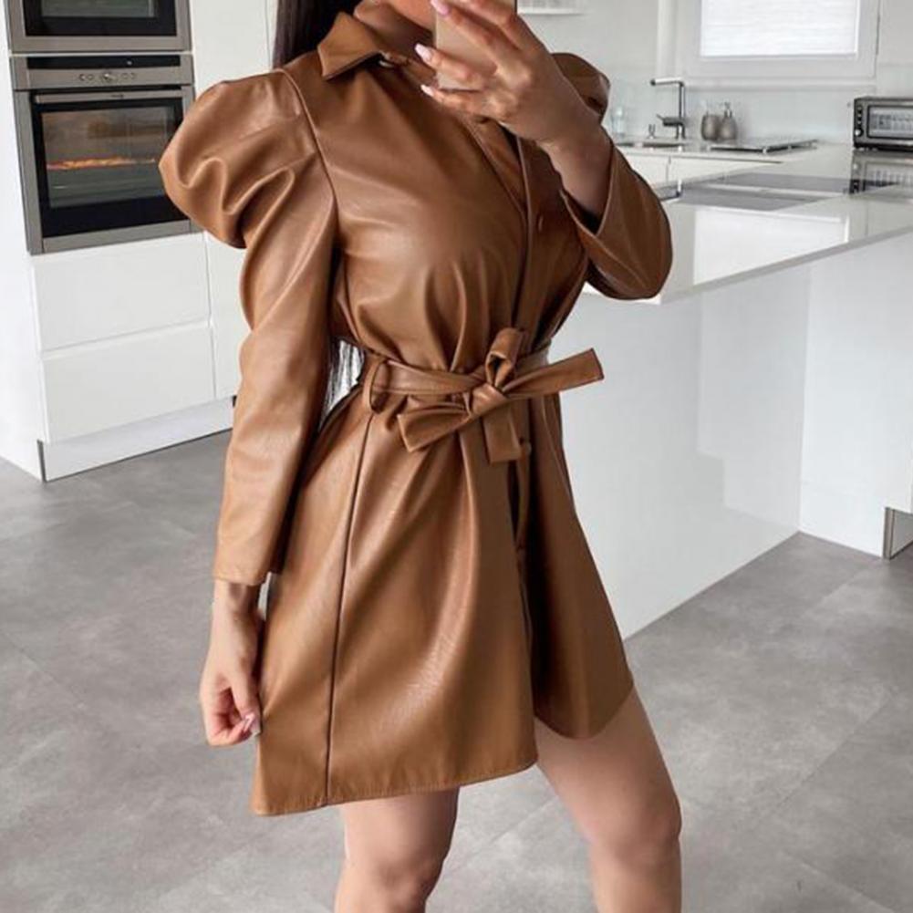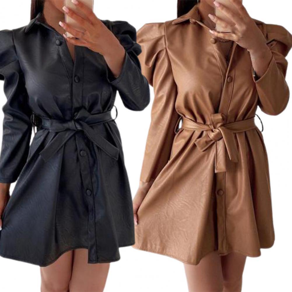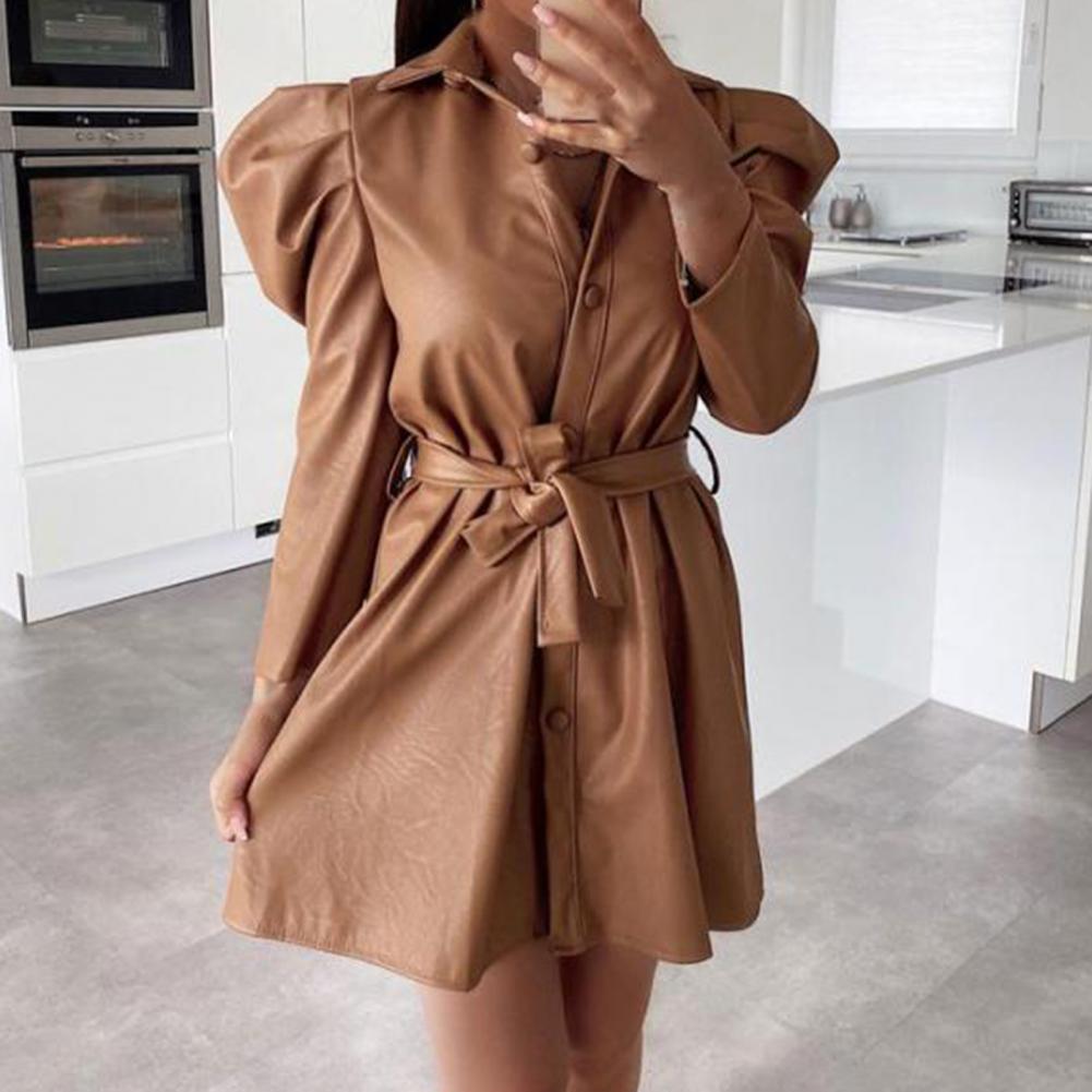 Платье из искусственной кожи с пышными рукавами и поясом; Сезон осень-зима; Однотонное мини-платье с лацканами для повседневной носки