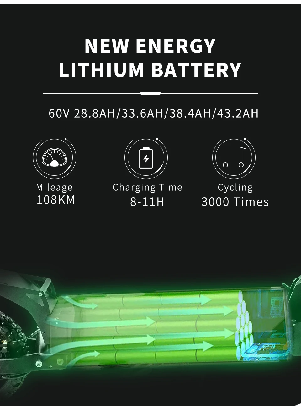 Батарея Ёмкость: 60V 28. 8ач/33.6Ah/38.4Ah/43.2Ah