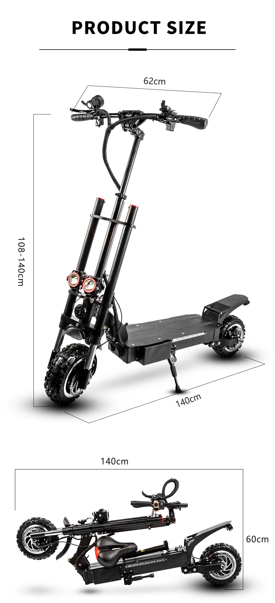 Передние и задние установлены 11 дюймовые пневматические внедорожные шины с внутренними трубами по умолчанию, которые износостойкие, крепкие сцепление, хорошая амортизация. Легко заменить внутренние и внешние шины, очень практично.