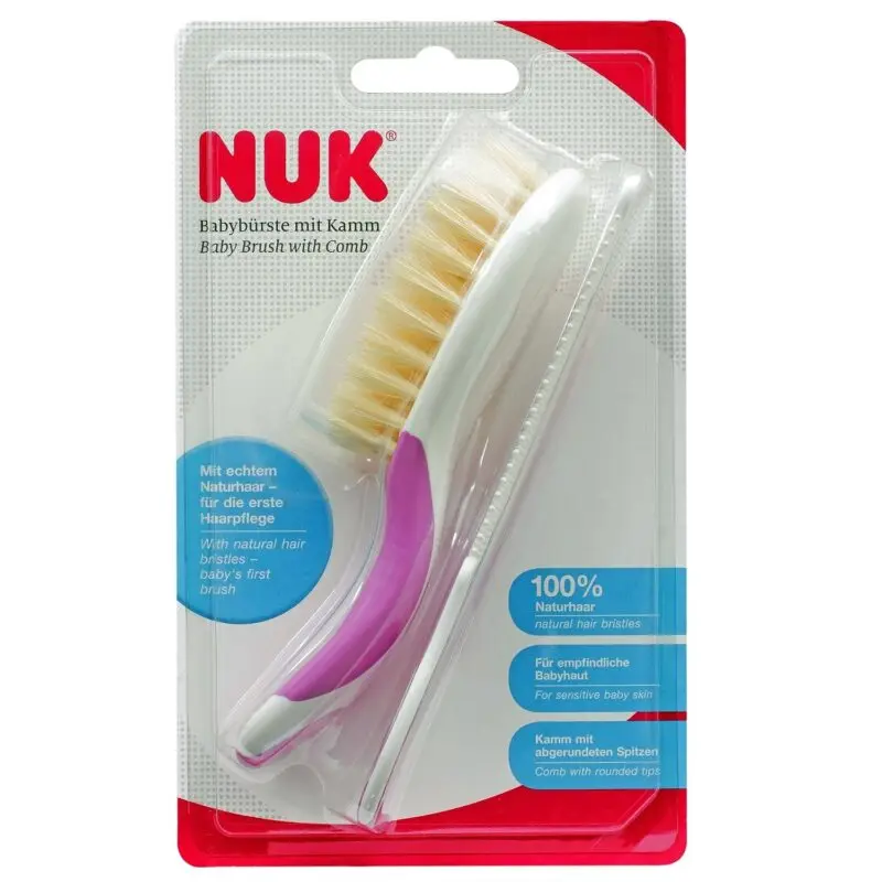 Набор Nuk щетка+расческа очень мягкая щетка с натуральной щетиной нежно массирует кожу головы вашего малыша. Щетка идеально подходит для детей первых месяцев жизни, чья голова покрыта нежным пушком.
