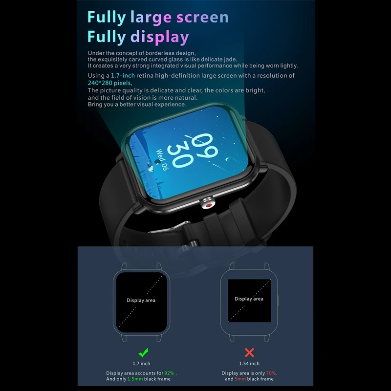 1. 1,7-дюймов чувствительной полный Пресс экран: Наши умные часы на системе андроид использует Высокочувствительный ёмкий 1,7-автофара изогнутой формы для IPS высокой четкости Пресс экран с разрешением 240x280. Это дает вам лучший интерактивный опыт и может быстро получить данные упражнений. Вы можете найти большое удовольствие благодаря плавным рабочим процедурам, яркому информационному дисплею и элегантному интерфейсу.