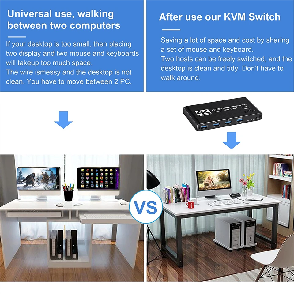 【 4K @ 60Hz 2 порта USB KVM HDMI переключатель Box】 Navceker 4K HDMI KVM Switcher Box позволяет управлять 2 компьютером только с одним набором элементов управления и экрана дисплея (мышь и клавиатура). Встроенные высокопроизводительные чипы, используются высокие технологии для декодирования, подключения и воспроизведения, не нужно водить. Это будет хорошим выбором для предприятия, офиса, мультимедийного обучения, конференц-зала, игровой комнаты, домашнего кинотеатра, исследования и т. д.