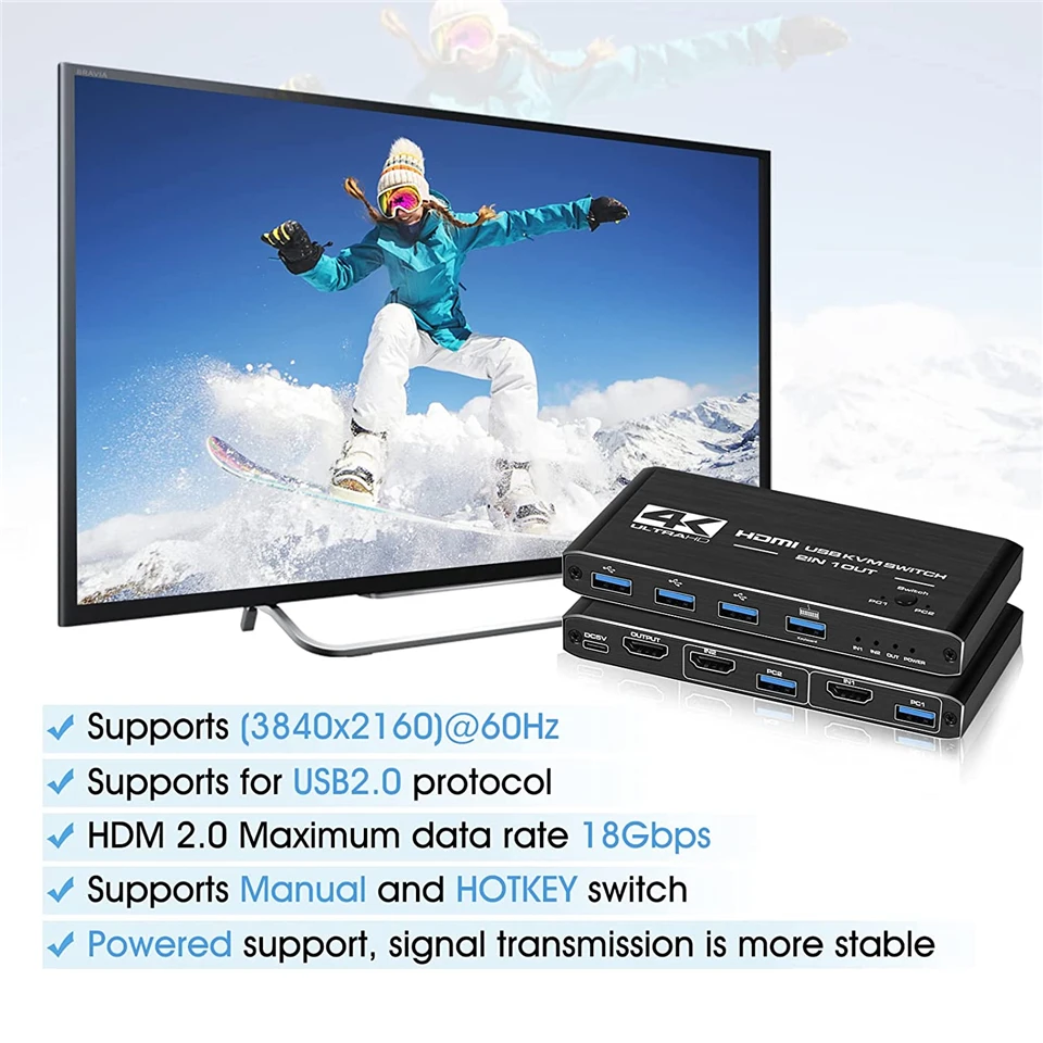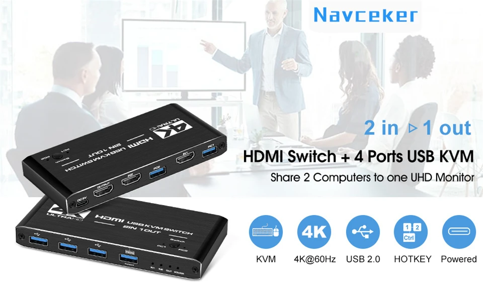 ZY-AK2,Navceker 4K @ 60Hz HDMI USB KVM переключатель позволяет поделиться одной USB клавиатурой, USB мышкой и одним HDMI монитором для управления 2 компьютерами, ноутбуками, игровыми консолями.