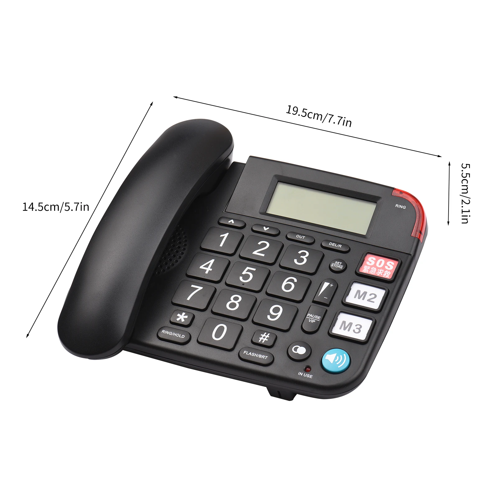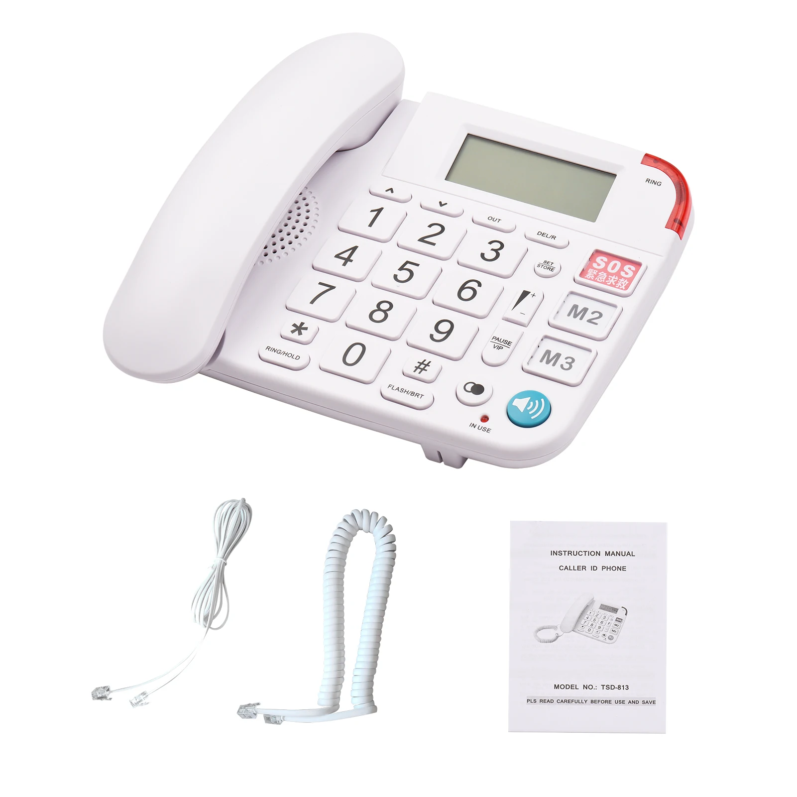 Характеристики:<;br/> дружелюбный телефон для пожилых людей с большими кнопками, который питается от телефонной линии, пожалуйста, установите 3 * AA (не входит в комплект) батареи, чтобы сохранить номер в телефоне, даже когда питание выходит.<;br/> многофункциональная Совместимость с DTMF/FSK/ETSI. И 16 цифр LCD/последний номер повторного набора/61 входящие звонки память/16 исходящая память, 3 One touch воспоминания, 1 будильник и музыка на функции удержания, 21 вид мелодий звонка для выбора, И т. Д.<;br/> Уровень мелодии-вы можете настроить уровень мелодии звонка с помощью & quot;Switch & quot; На задней панели телефона, переключиться на & quot;l & quot; для низкого объема, & Quot; h & quot; Для большого объема.<;br/> легкий и простой дизайн шрифта на кнопке четко печатается и легко для пожилых людей определить легкий телефон, который может быть помещен на любых поверхностях.<;br/> широкое применение-компактный размер и удобный дизайн, подходит для семейного дома, отеля и т. д. <;br/> Спецификация:<;br/> Модель: TSD-813<;br/> Материал: ABS<;br/> Цвет: белый, черный (По желанию)<;br/> Подсветка Мощность: 3 * AA (не входят в комплект поставки)<;br/> продукт Размеры: 19,5x14,5x5,5 см/7,7x5,7 x 2.1in <;br/> Товар Вес: 473g<;br/> посылка Размеры: 20,3x20,1x6 см/8x7,9 x 2.4in<;br/> посылка Вес: 604g/21,3 oz<;br/> Упаковочный лист:<;br/>1 x телефон <;br/>1 x Спиральный шнур для трубки <;br/>1 x телефонный шнур <;br/>1 x Руководство пользователя