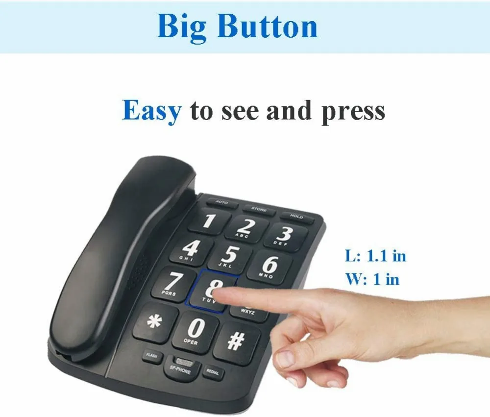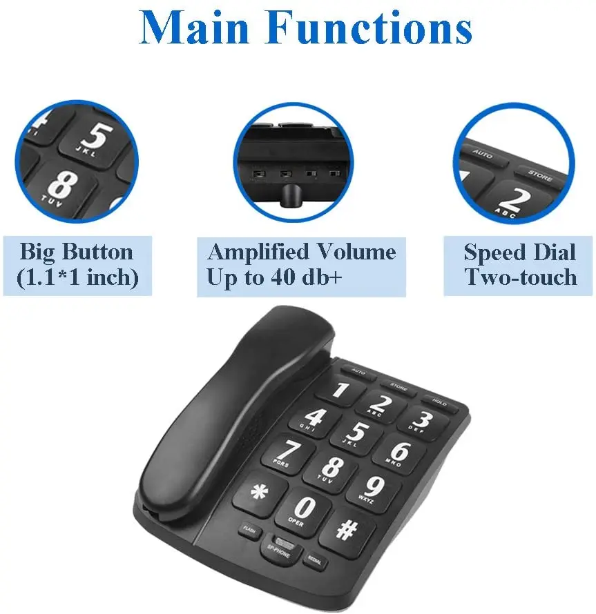 Описание:<;br/> большая кнопка проводного телефона будет работать в любой ситуации отключения питания. В случае потери мощности проводной телефон может быть вашим единственным средством связи! Рекомендуется иметь проводной телефон дома.<;br/> усиленный звук может сделать разговор не только громче, но и яснее, хороший выбор для людей с слуховыми аппаратами <;br/> очень большие кнопки-большие клавиши с четкими и цветными числами, очень легко увидеть, Подходит для пожилых людей с низким видением <;br/> скоростной циферблат-обеспечивает 10 двухсенсорных программируемых кнопок памяти для часто чисел dia светодиодный <;br/> Многофункциональный яркий светодиодный индикатор для входящих вызовов; Удерживающий ключ для прослушивания музыки; Стол и стена Возможность крепления <;br/> характеристики:<;br/> Громкая связь <;br/>10 числовых скоростей <;br/> регулятор громкости звонка <;br/> Дополнительные Большие кнопки для легкого набора <;br/> удержания, повторного набора & amp; Функции вспышки <;br/> стол или настенный <;br/> работает при отключении питания переменного тока требуется <;br/> посылка, включая <;br/>1 x большая кнопка пожилых проводников телефона <;br/>1 x шнур <;br/>1 x пользователь Руководство по эксплуатации