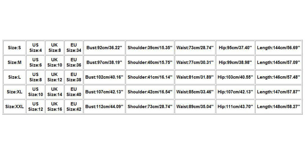 Размеры США Великобритания ЕС Бюст Плечо Талия Бедра Длина S 4 8 34 92 см/36,22'' 39 см/15,35'' 73 см/28,74'' 95 см/37,40'' 144 см/56,69'' М 6 10 36 97 см/38,19'' 40 см/15,75'' 77 см/30,31'' 99 см/38,98'' 145 см/57,09'' L 8 12 38 102 см/40,16'' 41 см/16,14'' 81 см/31,89'' Высота каблука 10 см/3,94 "3 146 см/57,48'' XL 10 14 40 107 см/42,13'' 42 см/16,54'' 85 см/33,46'' 107 см/42,13'' 147 см/57,87'' XXL 12 16 42 112 см/44,09'' 43 см/16,93'' 89 см/35,04'' 111 см/43,70'' 148 см/58,27''