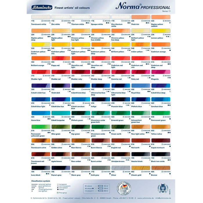 Масляные краски серии Norma professional имеют очень чистые тона, повышенный блеск и глубокую интенсивность цветов. Исключительно высокая светостойкость, цветовой диапазон хорошо сбалансирован. Он имеет приблизительно одинаковое распределение разных цветовых групп и хороший баланс между укрывистыми, полупрозрачными и прозрачными цветами. Максимальная концентрация наилучших художественных пигментов. Это серия премиум-класса для настоящих ценителей качества художественных материалов. Краски отличаются высокой концентрацией высококачественных пигментов, а также - основой из разнообразных растительных масел с высокой степенью очистки. Все краски в серии имеют высокую светостойкость с уровнем 4 и 5. Краски имеют ровную консистенцию и свободно ложатся на поверхность, не оставляя рельефных мазков. Краска серии Norma professional отлично подходит тем, кто любит писать пастозно, в технике алла-прима (по сырому).