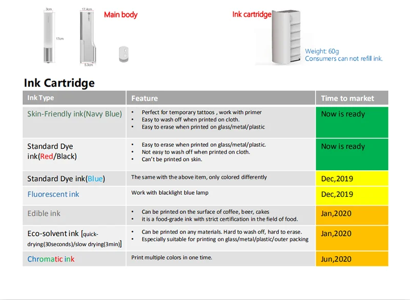 Бесплатная доставка струйный принтер мини-маркер для небольших подарков с изображением логотипа струйная печать на бумаге или коже & lt; br/& gt; Работа: WIFI link & lt; br/& gt; особенности: несколько вариантов чернил & lt; br/& gt; Эффективность: печать за одну секунду & lt; br/& gt; Материалы печати: нет ограничений на материалы могут быть напечатаны & lt; br/& gt; Вес: 255g & lt; br/& gt; Размер: 174*53*30 мм & lt; br/& gt; Сетевое подключение wifi 802,11 b/g/n & lt; br/& gt; Емкость 1200 мАч, 7,2 V & lt; br/& gt; Зарядный интерфейс type-c & lt; br/& gt; Система требует Android/IOS & lt; br/& gt; датчик ролика захвата движения & lt; br/& gt; Полный срок службы батареи может напечатать 2000 раз & lt; br/& gt; Примечание: принтер включает в себя Черный чернильный картридж темно-синего цвета. Теперь мы можем поставлять только черные чернила на водной основе и чернила темно-синего цвета, которые больше подходят для печати на бумажных материалах или на коже, потому что чернила не являются постоянными. & lt; br/& gt; У нас есть покрытие, которое можно распылить на поверхности, а затем напечатать, чтобы сделать его постоянным, который подходит для пластика, металла, стекла, Ткань... практически любой материал. Если вам нужно, пожалуйста, нажмите на картинку ниже, мы отправим этот товар отдельно, так как он содержит жидкость. Спасибо