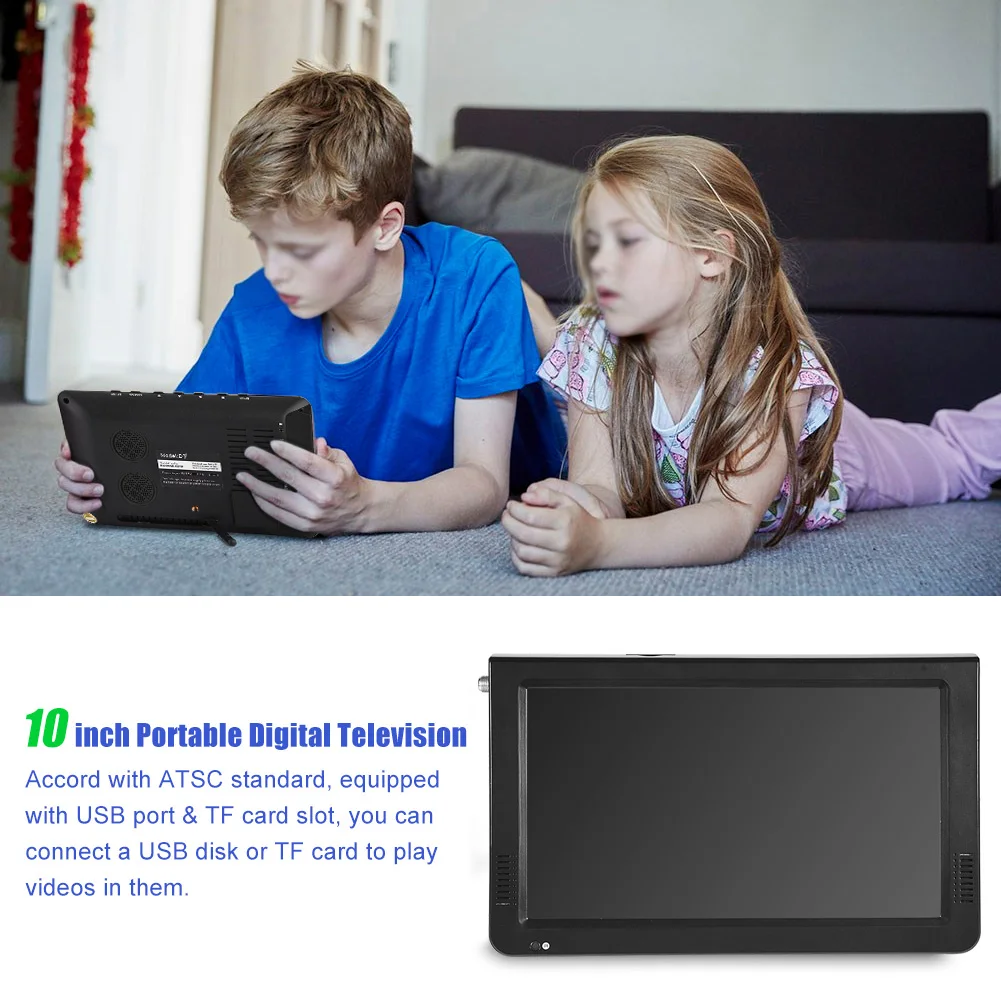 US plug fits for:Canada, United States, Mexico, El Salvador, Dominican Republic, Puerto Rico (USA),The United States Virgin Islands<;br/>EU plug fits for:South Korea<;br/>Description:<;br/>This is a portable digital TV. You can insert a USB disk or Memorycard to the ports at the side and play the videos you download previously. The multimedia player with 2 built-in high-performance speakers will deliver HD sound to your ears. It supports HDMI-compatible video, you can watch TV in high quality. It is made from ABS material, durable and lightweight, no much burden to your hands. Or you can put it on a flat surface or fix it to wall to watch TV.<;br/>Features:<;br/>Portable digital TV, accord with ATSC standard, do not support analog TV.<;br/>Equipped with USB port &memorycardslot you can connect a USB disk or memory card to play videos in them.<;br/>Support 1080P video in MKV, MOV, AVI, WMV, MP4, FLV, MPEG1-4, RMVB, MP3 format.<;br/>Built-in rechargeable lithium battery, can be used for outdoors.<;br/>High sensitivity tuner to enhance signal reception capability.<;br/>With bracket and 12V car charger, easy and convenient to use.<;br/>Specifications:<;br/>Received channels<;br/>ATV 48.25mhz ~ 863.25mhz<;br/>Digital TV VHF<;br/>50MHz ~ 230MHz<;br/>Digital TV UHF<;br/>474mhz ~ 862mhz<;br/>Display<;br/>Color TFT-LED<;br/>Interface<;br/>Antenna Interface, VGA Interface, AV Input Interface, AV Output Interface, Headphone Interface,HDMI-compatibleInterface, USB Interface, Power Interface, Power Switch, Memory/MMC Card<;br/>Speaker<;br/>Two 32mm Round Speakers<;br/>Power Supply<;br/>DC12V<;br/>Power consumption<;br/>18w<;br/>Audio output<;br/>2W (maximum)<;br/>Size<;br/>26*16.5*2.7cm/ 10.24*6.49*1.06inch<;br/>Screen length<;br/>10 inch,12.7*22.3cm<;br/>Battery capacity<;br/>1500 mah<;br/>Screen Size Ratio<;br/>16:09<;br/>Resolution<;br/>1024X600<;br/>Power Plug<;br/>US, EU (optional)<;br/>Package List:<;br/>1 * 10inch ATSC Portable TV<;br/>1 * AV Cable<;br/>1 * Remote Control<;br/>1 * Antenna<;br/>1 * Power Plug<;br/>1 * Suction Cup Mount<;br/>1 * Car Cigar Lighter Charger<;br/>1 * User Manual<;br/>Note:<;br/>Please note that the new type and old type of this product will be sent randomly, and make sure you will not mind before ordering.<;br/>