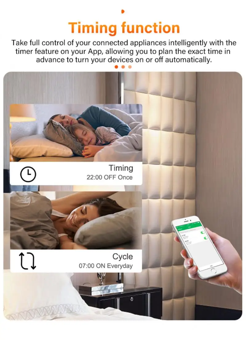 Беспроводной пульт дистанционного управления: удобно управлять подключенными устройствами с помощью бесплатного мобильного приложения «Smart Life/tuya» независимо от того, где вы находитесь. (Совместимость с Android и iOS.) контролируйте свои приборы заранее, когда вы находитесь вдали от дома.
