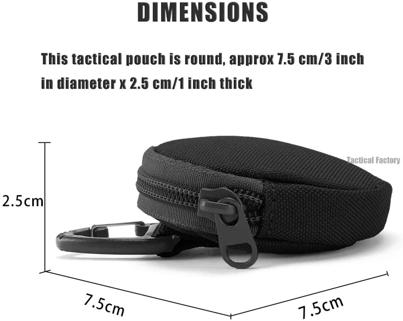 【Размер 】Наш маленький тактическая сумка круглой формы, а его размер составляет 7,5*7,5*2,5 см. Компактный и легко носить с собой.