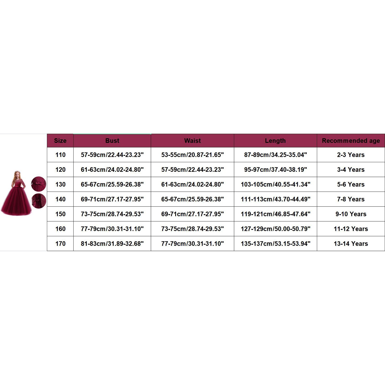 Размеры Бюст Талия Длина Рекомендуемый возраст 110 57-59 см/22,44-23,23'' 53-55 см/20,87-21,65'' 87-89 см/34,25-35,04'' От 2 до 3 лет 120 61-63 см/24,02-24,80'' 57-59 см/22,44-23,23'' 95-97 см/37,40-38,19'' От 3 до 4 лет 130 65-67 см/25,59-26,38'' 61-63 см/24,02-24,80'' 103-105 см/40,55-41,34 дюйма От 5 до 6 лет 140 69-71 см/27,17-27,95 дюйма 65-67 см/25,59-26,38'' 111-113 см/43,70-44,49 дюйма От 7 до 8 лет 150 73-75 см/28,74-29,53'' 69-71 см/27,17-27,95 дюйма 119-121 см/46,85-47,64'' От 9 до 10 лет 160 77-79 см/30,31-31,10'' 73-75 см/28,74-29,53'' 127-129 см/50,00-50,79'' 11-12 лет 170 81-83 см/31,89-32,68'' 77-79 см/30,31-31,10'' 135-137 см/53,15-53,94'' 13-14 летБрюки замечательные. Ткань приятна телу, завышенная талия делает фигуру стройнее. Пояс на резинке и шнурке не давит и хорошо держит,... Читать отзыв полностью...