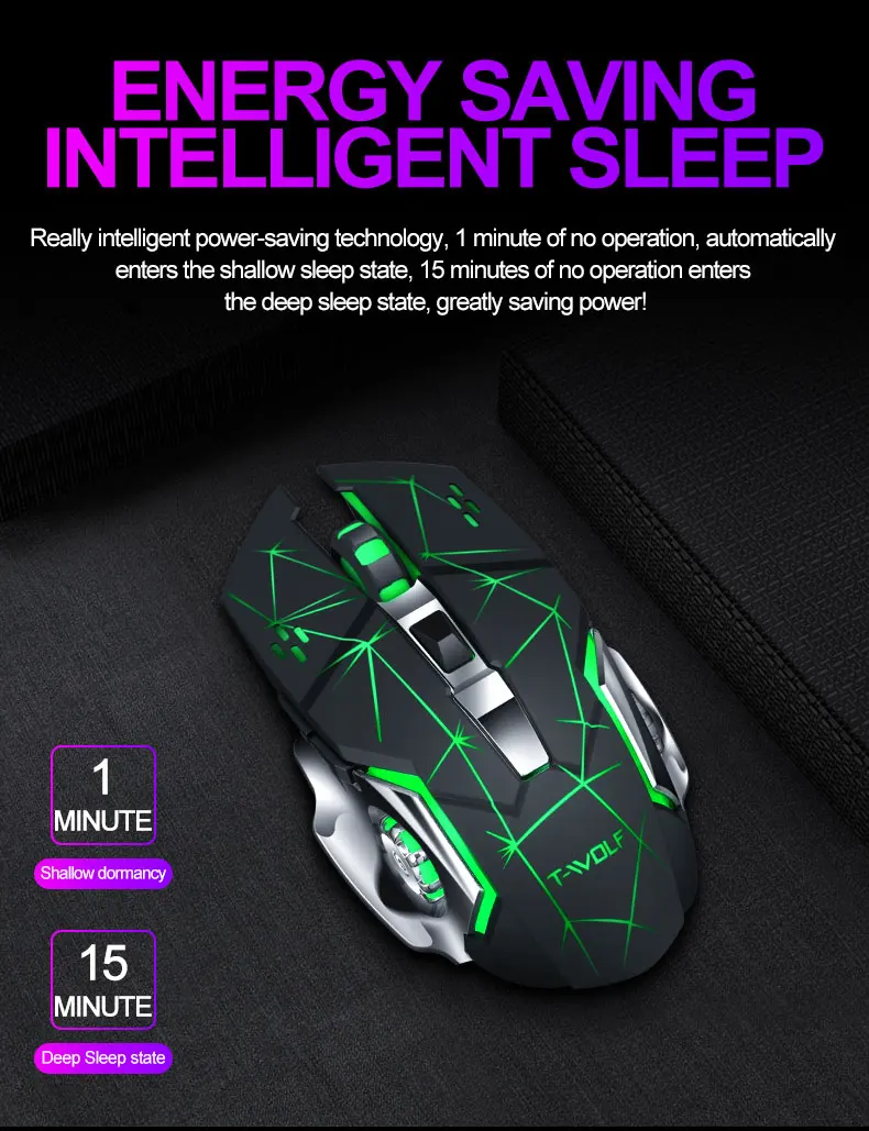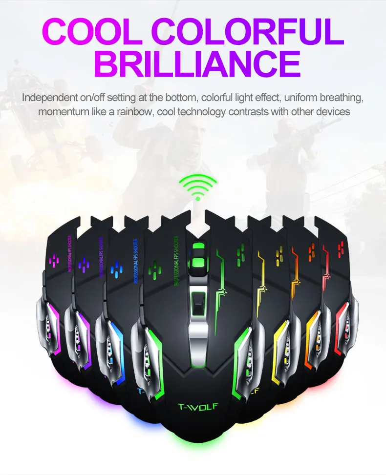 T-WOLF Q13 перезаряжаемая беспроводная мышь Бесшумная эргономичная игровая мышь 6 клавиш RGB подсветка 2400 DPI для ноутбука Pro Gamer/ PC компьютер/ноутбук