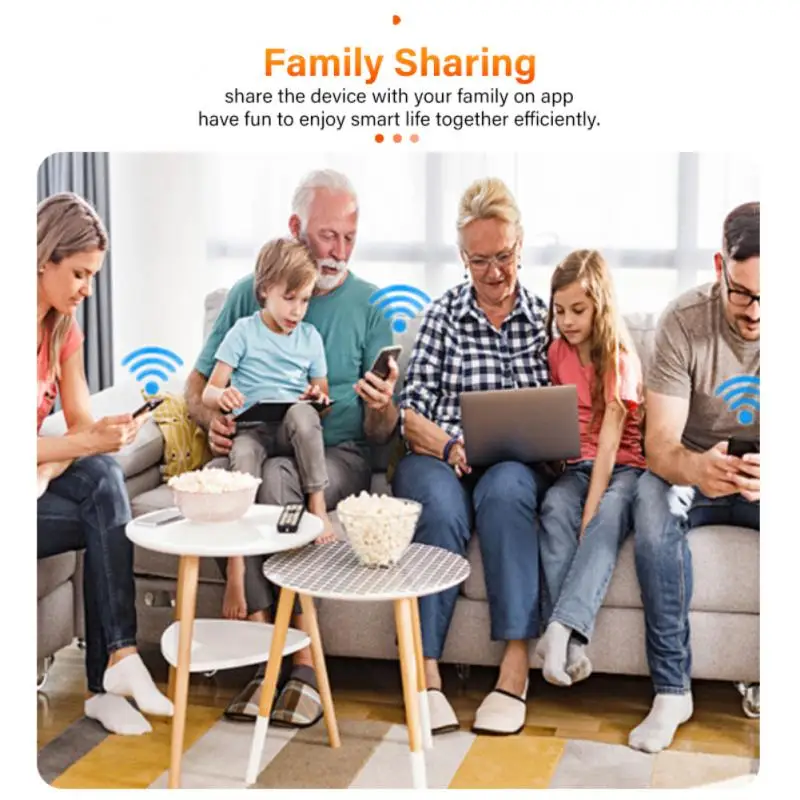 Поделитесь контролем с семьей или друзьями для максимального удобства, управления и мониторинга подключенных устройств вместе. Поддержка нескольких телефонов для управления одним выключателем или одним телефоном для управления несколькими выключателями одновременно.