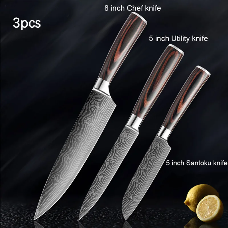 2. Материал лезвия-нержавеющая сталь 7cr17, светильник Поверхность лазерного Дамасского узора, такая красивая и высококлассная. Материал ручки-цветная древесина, перерабатываемый материал, экологически чистый.