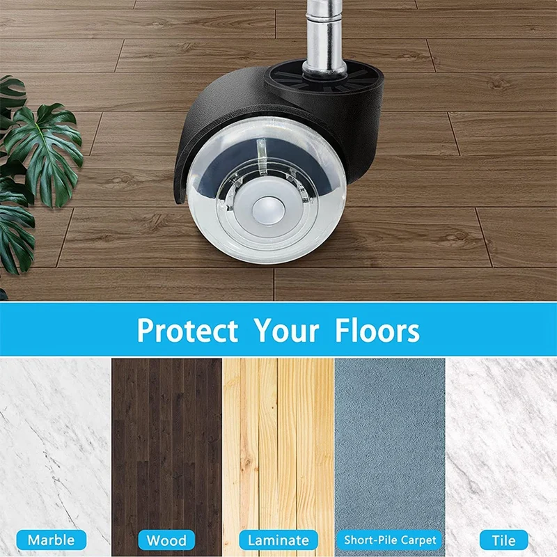 [Безопасная защита для всех полов]: эти колеса для офисных стульев покрыты сверхтолстым полиуретановым слоем и гарантированно не царапаются и не оставляют следов на любой поверхности даже без использования коврика для стульев. 100% безопасное скольжение по паркетному полу, ламинату, линолеуму, плитке, ковру с коротким ворсом. (Не рекомендуется использовать на коврике с шерстью более 2 см)