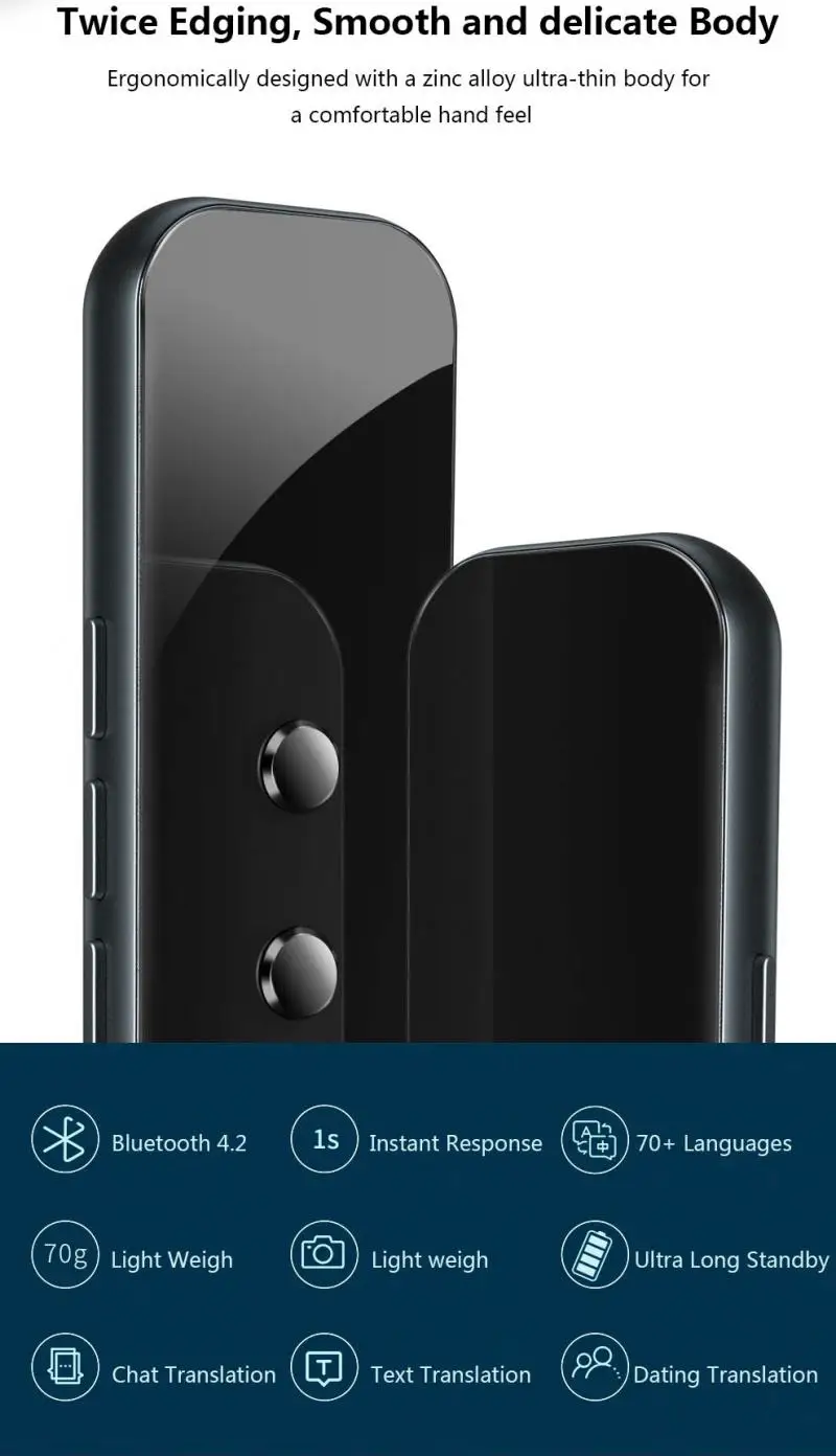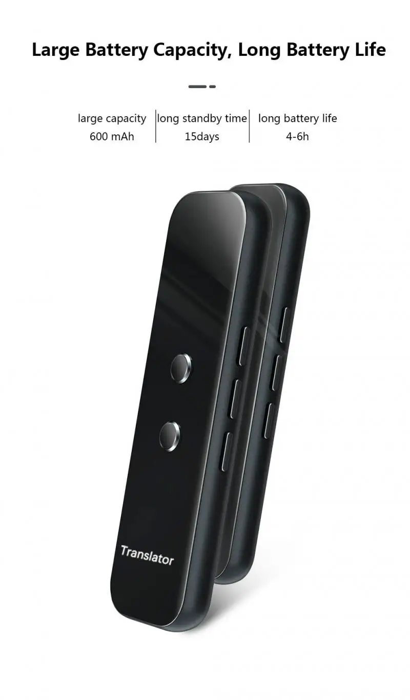4. ТекстПеревод: Поддержка текстового перевода. Широкая совместимость:Совместимость с большинством телефонов iOS и Android. Прочный и Перезаряжаемый:Встроенный 3,7 60mA перезаряжаемый аккумулятор, низкая потребеление энергии, plug andЛегко заряжается.