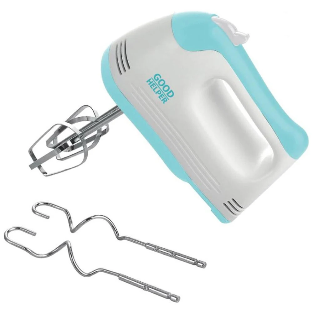 Миксер GOODHELPER HM-372 Классический миксер Goodhelper HM372 не занимает много места, но принесёт на современной кухне немало пользы. Эргономичная форма и продуманная конструкция делают его особенно удобным и эффективным, а после использования за ним легко ухаживать. Универсальность Устройство можно использовать для решения множества задач: приготовления теста и соусов, взбивания яиц. 5 скоростных режимов Скорость работы миксера можно регулировать, разработчики предусмотрели 5 скоростных режимов. Благодаря этому вы легко сможете приготовить смеси различной консистенции. Насадки в комплекте К миксеру прилагаются две насадки, с помощью которых можно приготовить более густое или более воздушное тесто. Также в комплект входят два венчика для взбивания. Для смены насадок достаточно нажать одну кнопку.