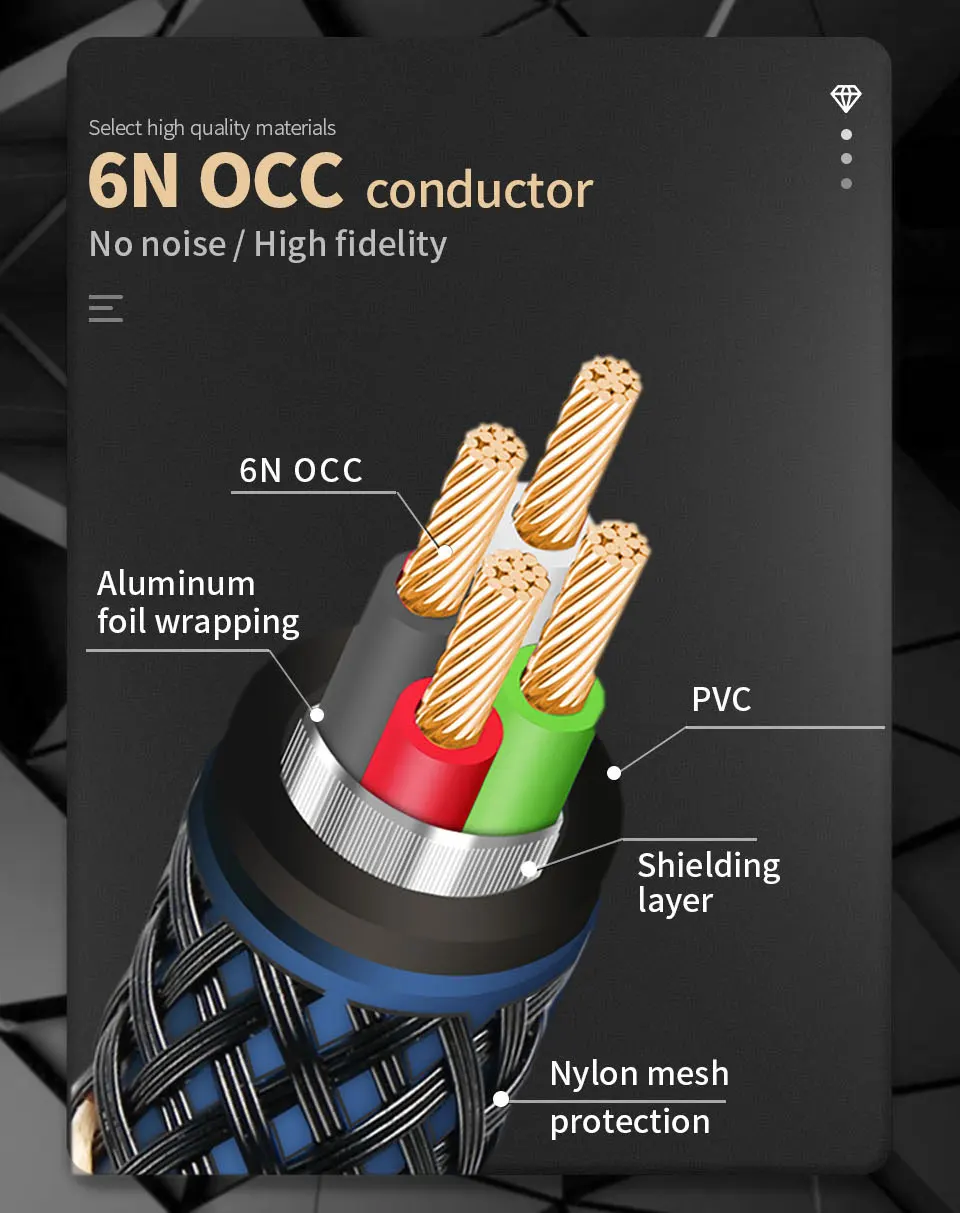 1. Кабель изготовлен из одинарной кристаллической медной проводимости, с очень небольшой потерей сигнала, сильной шумоподавлением, может отлично передавать отличное качество звука