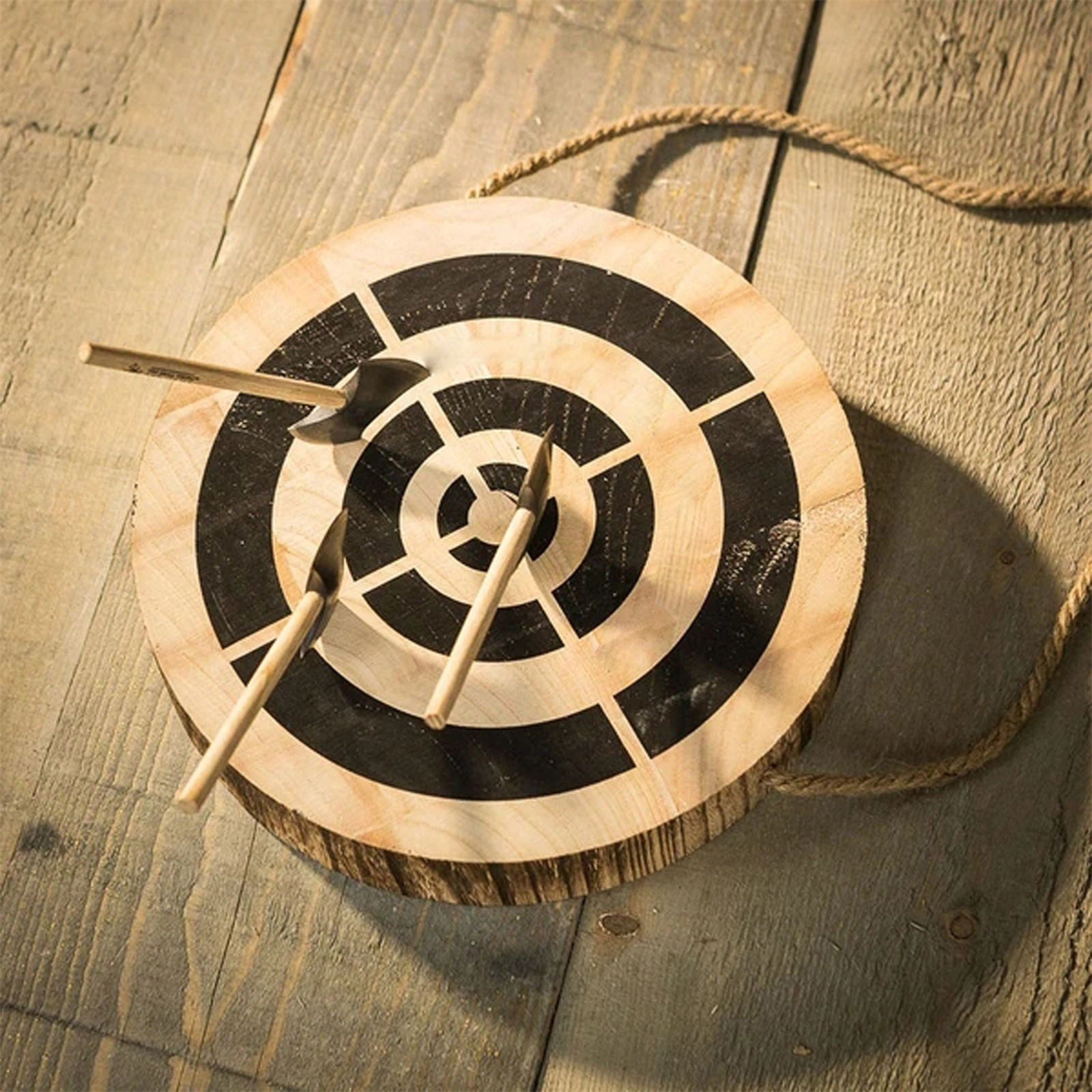 Игра поставляется с тремя маленькими осями и толстой мишенью, которую вы можете повесить и