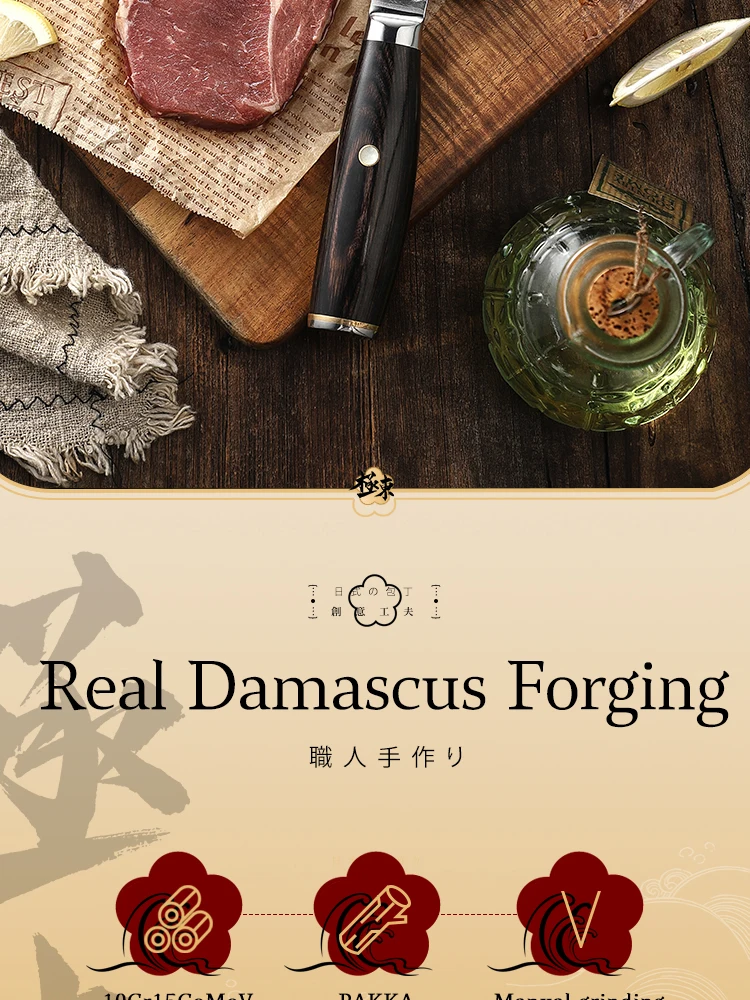 1: продукт использует V-gold 67 слоев Дамаска. Высокоэффективная сталь обеспечивает твердость, твердость, остроту и долговечность кухонного ножа.
